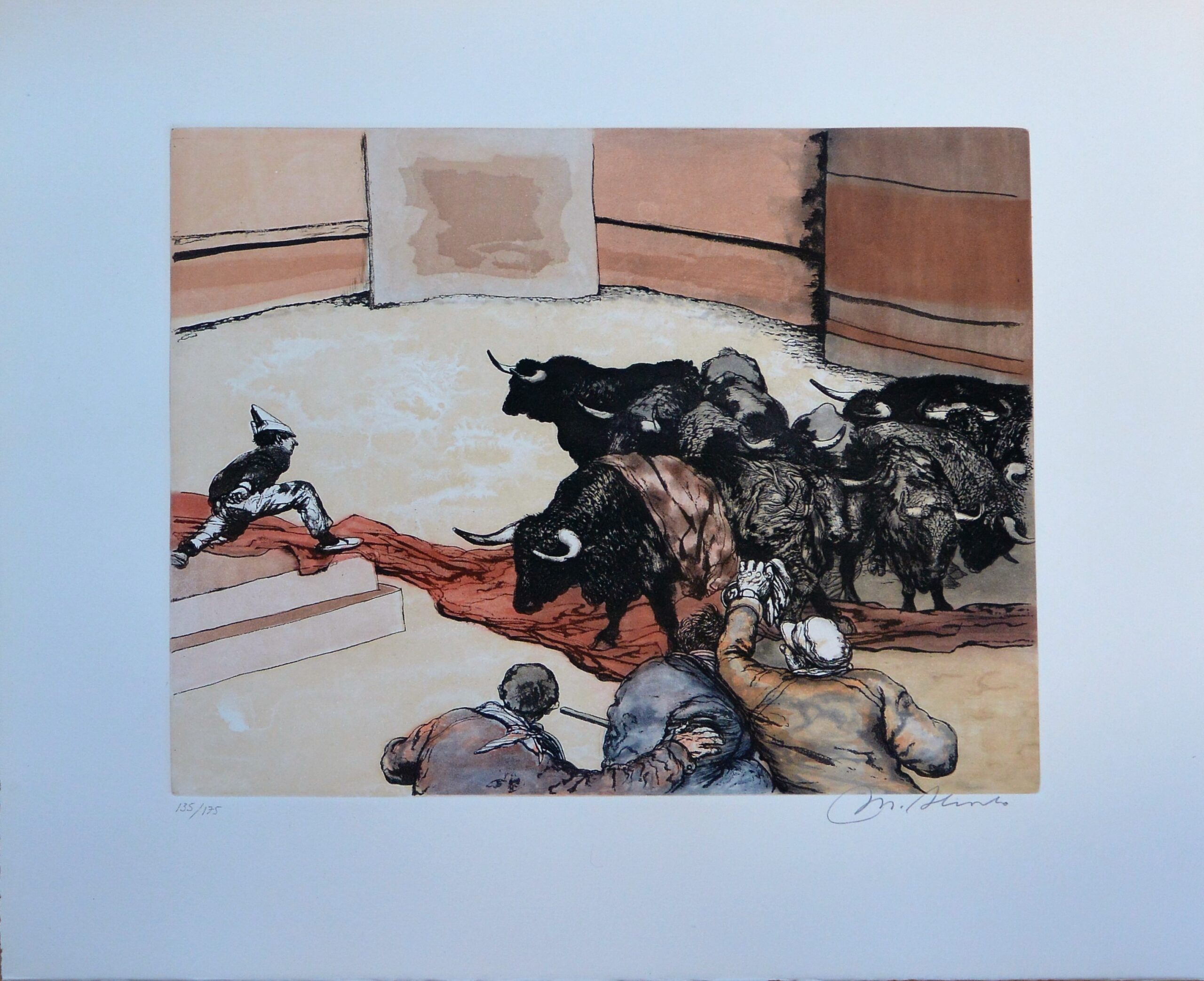 Manuel Alcorlo, Destrozones y tancredos, El grupo que incita con la lona, grabado aguafuerte aguatinta color, edición 175 ejemplares, numerado y firmado a lápiz, plancha 34×43,50 cms. y papel 51×62 cms.