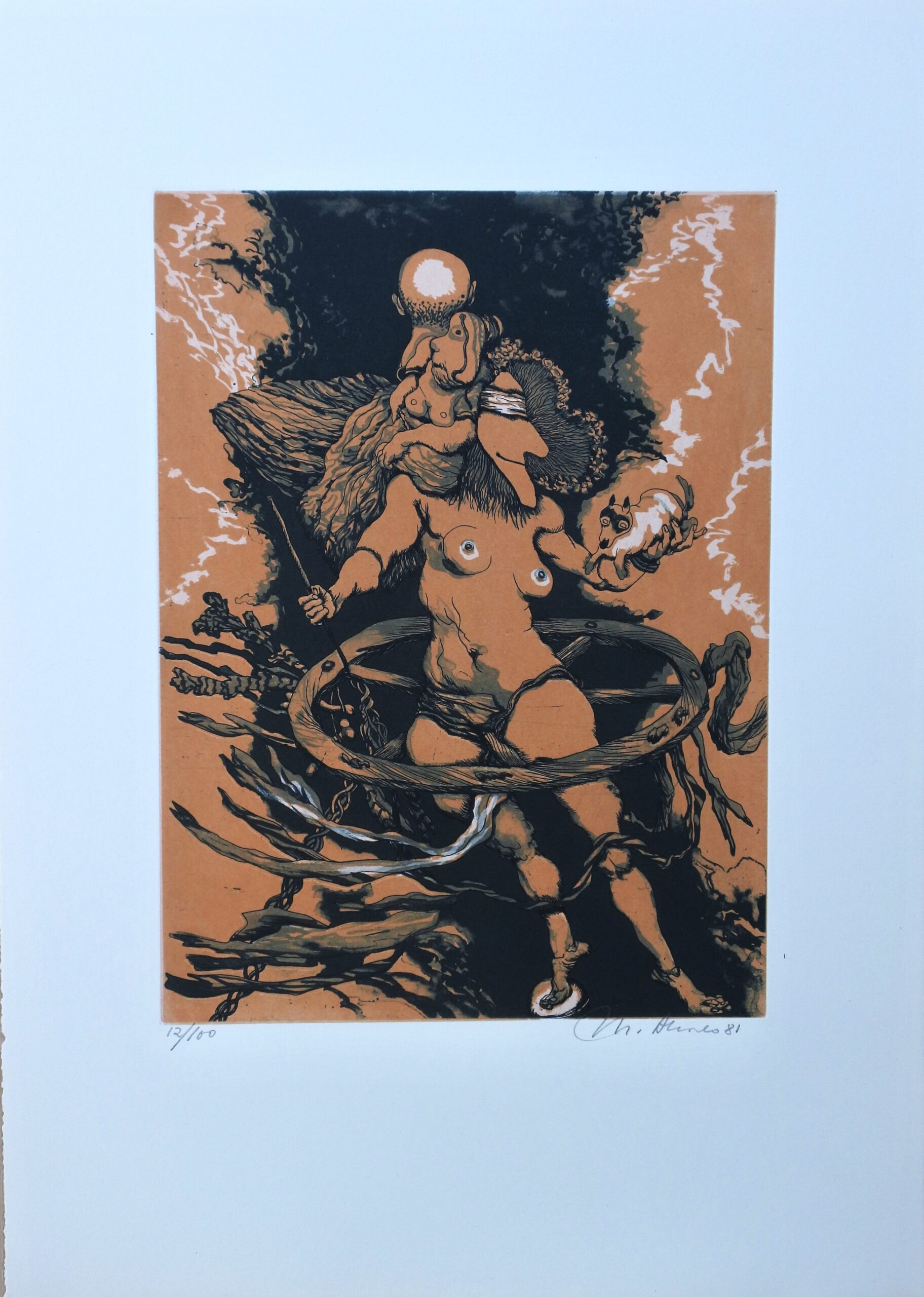 Manuel Alcorlo, Diezmo de las alcahuetas y las chillonas III, grabado aguafuerte, edición 100 ejemplares, numerado, datado 81 y firmado a lápiz, plancha 33×25 cms. y papel 53×38 cms.