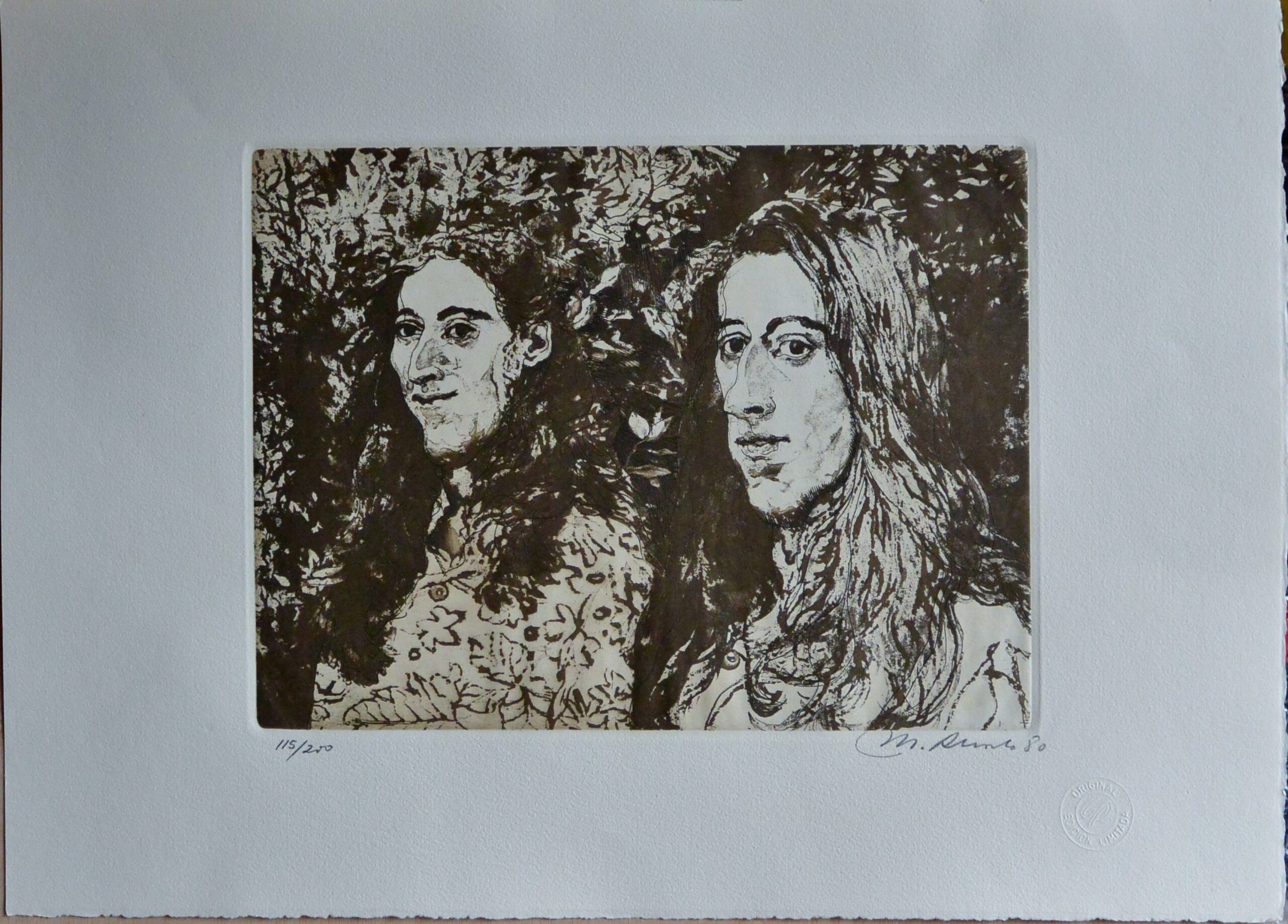 Manuel Alcorlo, Dos hermanas, grabado, edición 200 ejemplares, numerado, fechado y firmado a lápiz, huella 24×32 cms. y papel 38×53 cms.