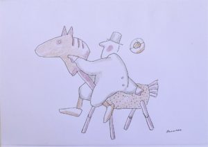 Manuel Alcorlo, El caballo de madera, dibujo técnica mixta papel, enmarcado, dibujo 15×21 cms. y marco 28×33 cms.