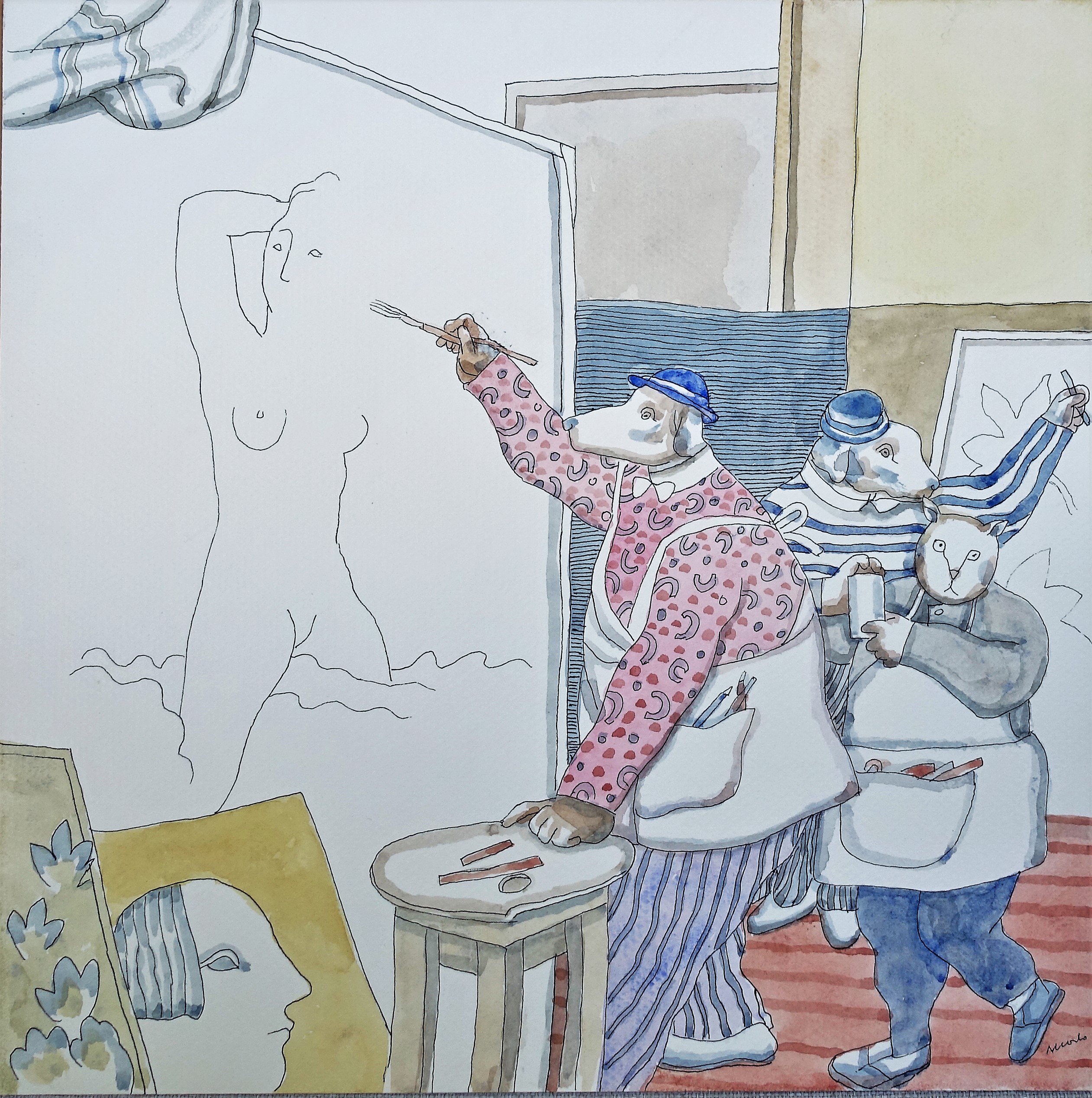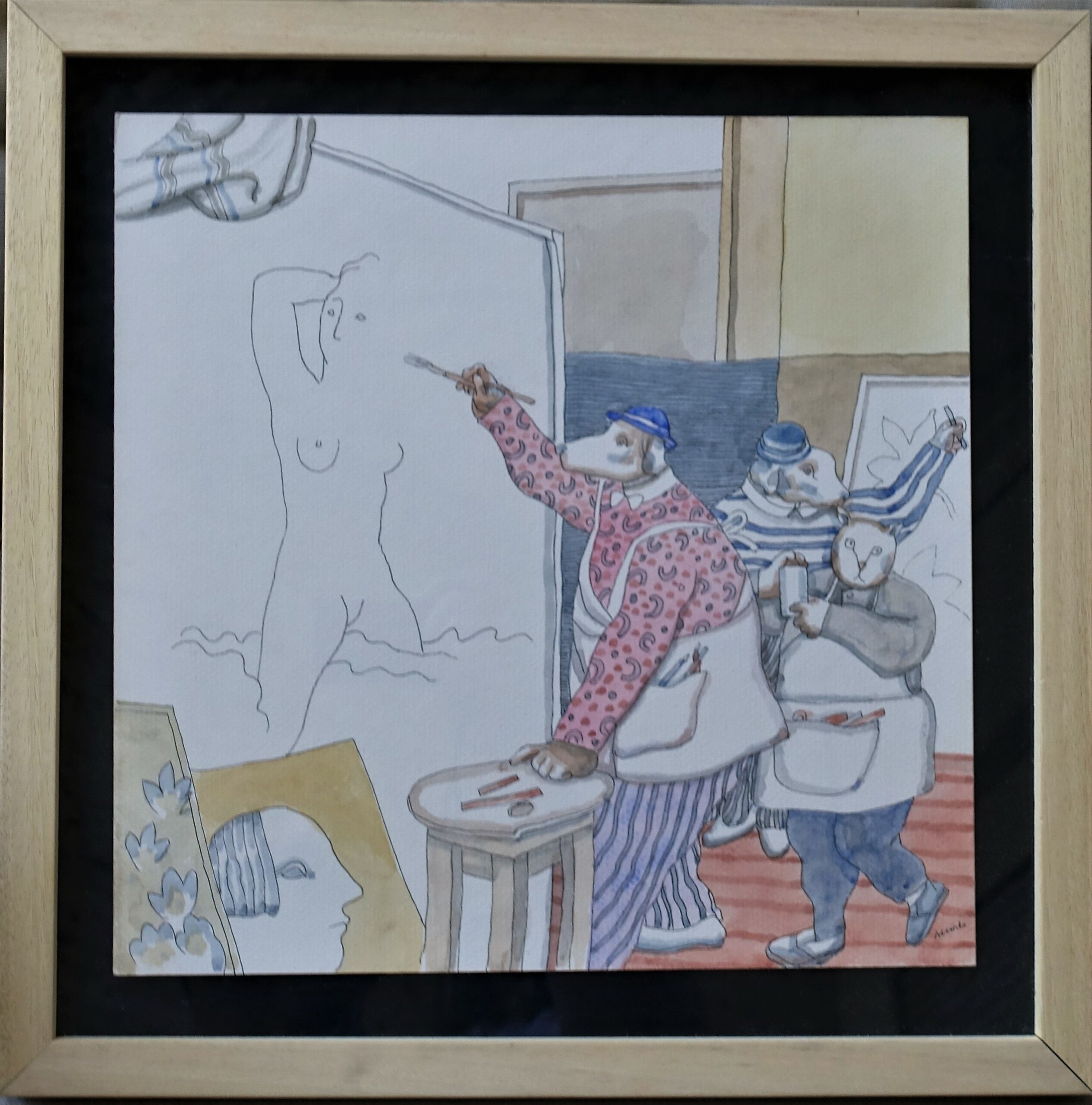 Manuel Alcorlo, El estudio de pintura I, dibujo tinta y acuarela sobre cartulina, enmarcado, dibujo 30×30 cms. y papel 38×38 cms.
