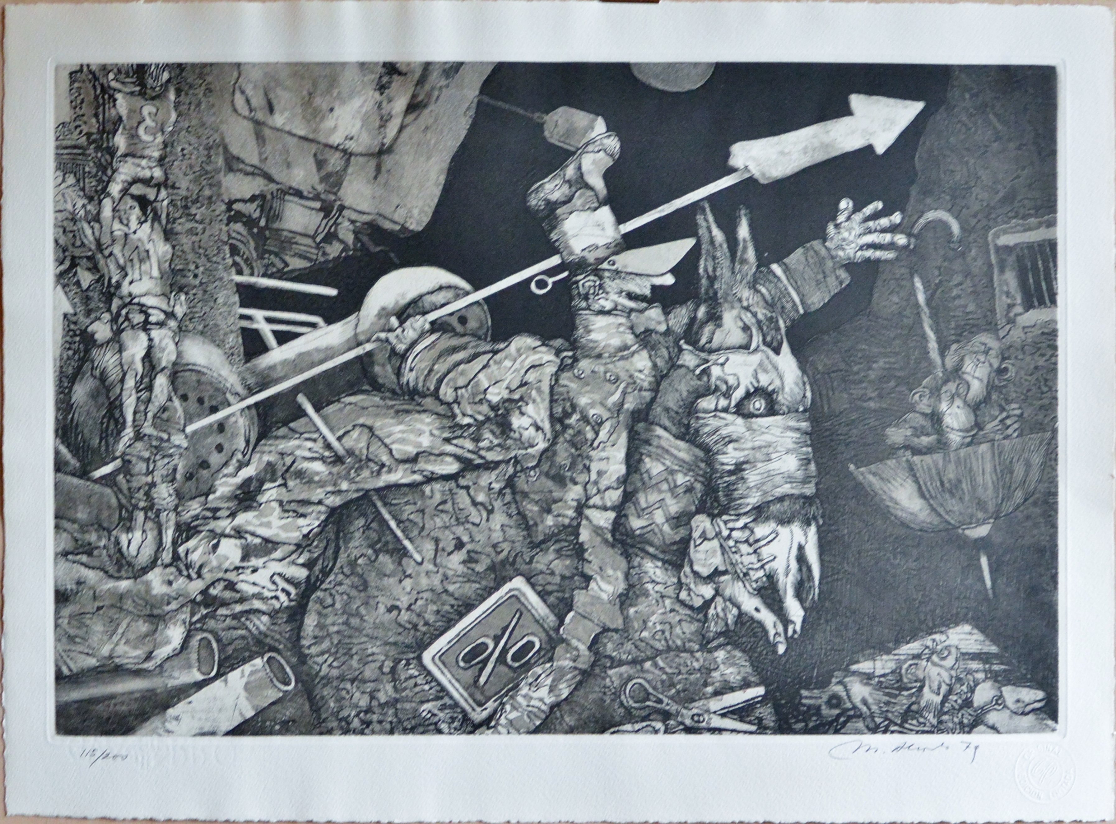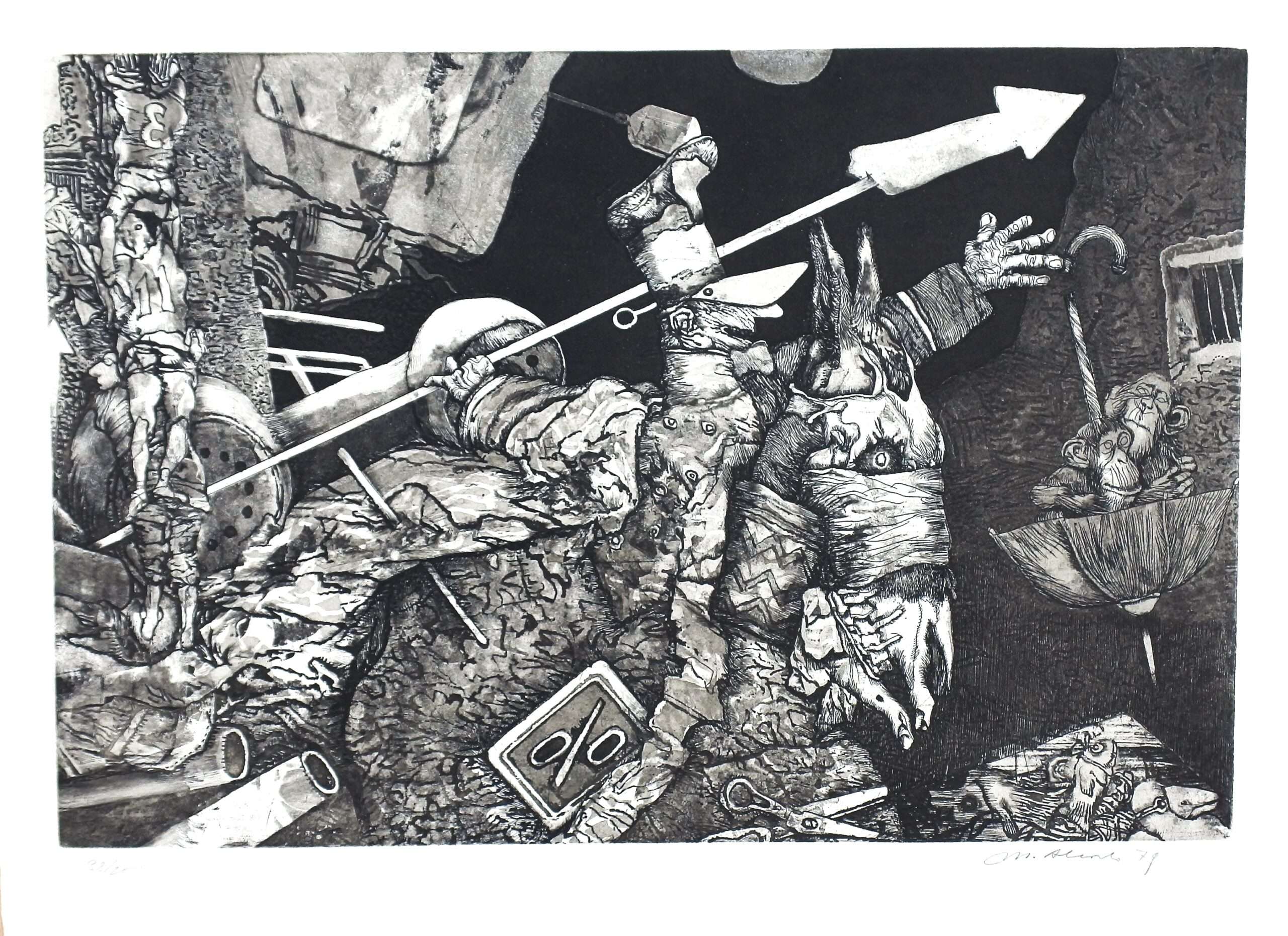 Manuel Alcorlo, El lanzador de flechas, grabado, edición 200 ejemplares, numerado, datado y firmado a lápiz, huella 32×49 cms. y papel 39×53 cms.