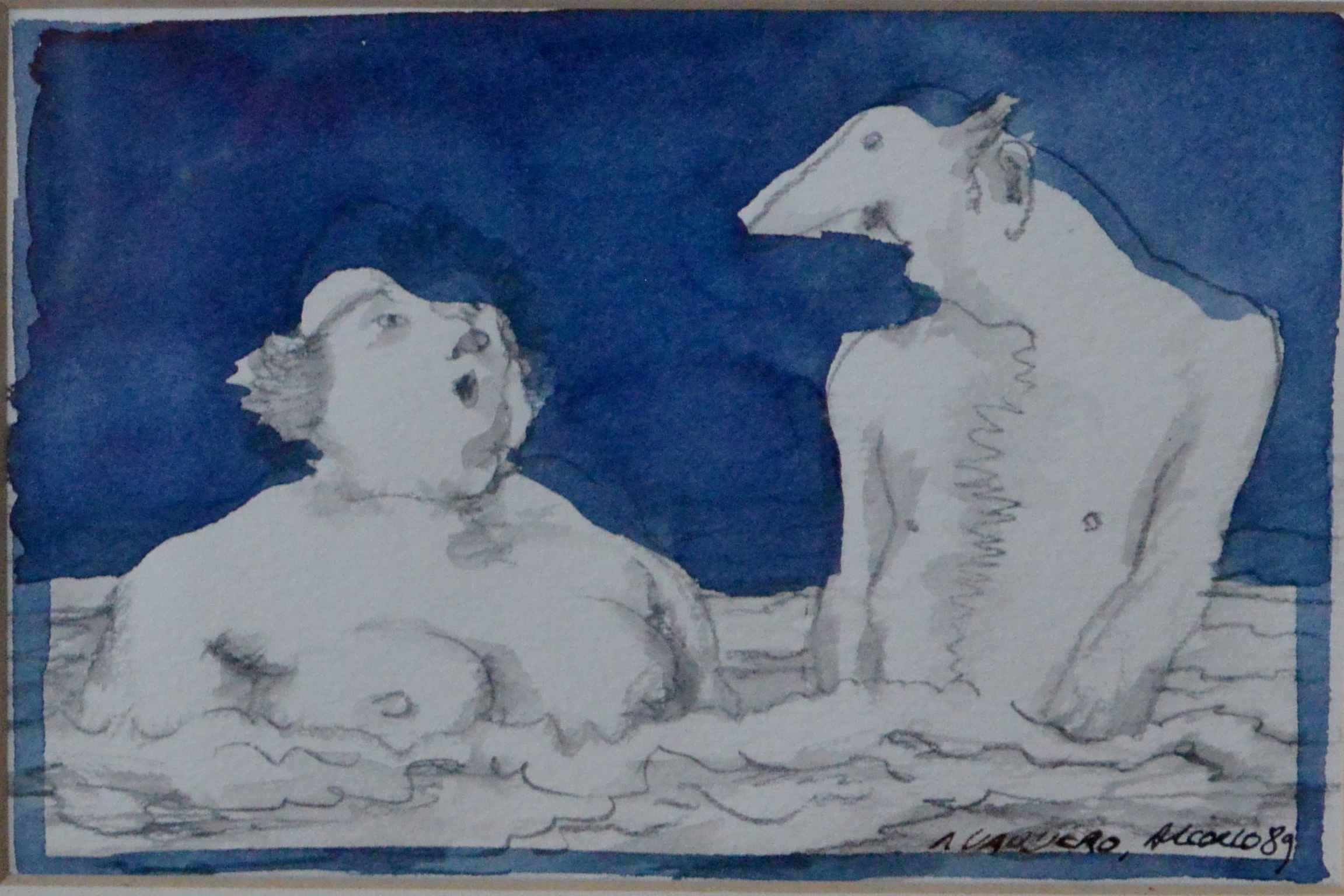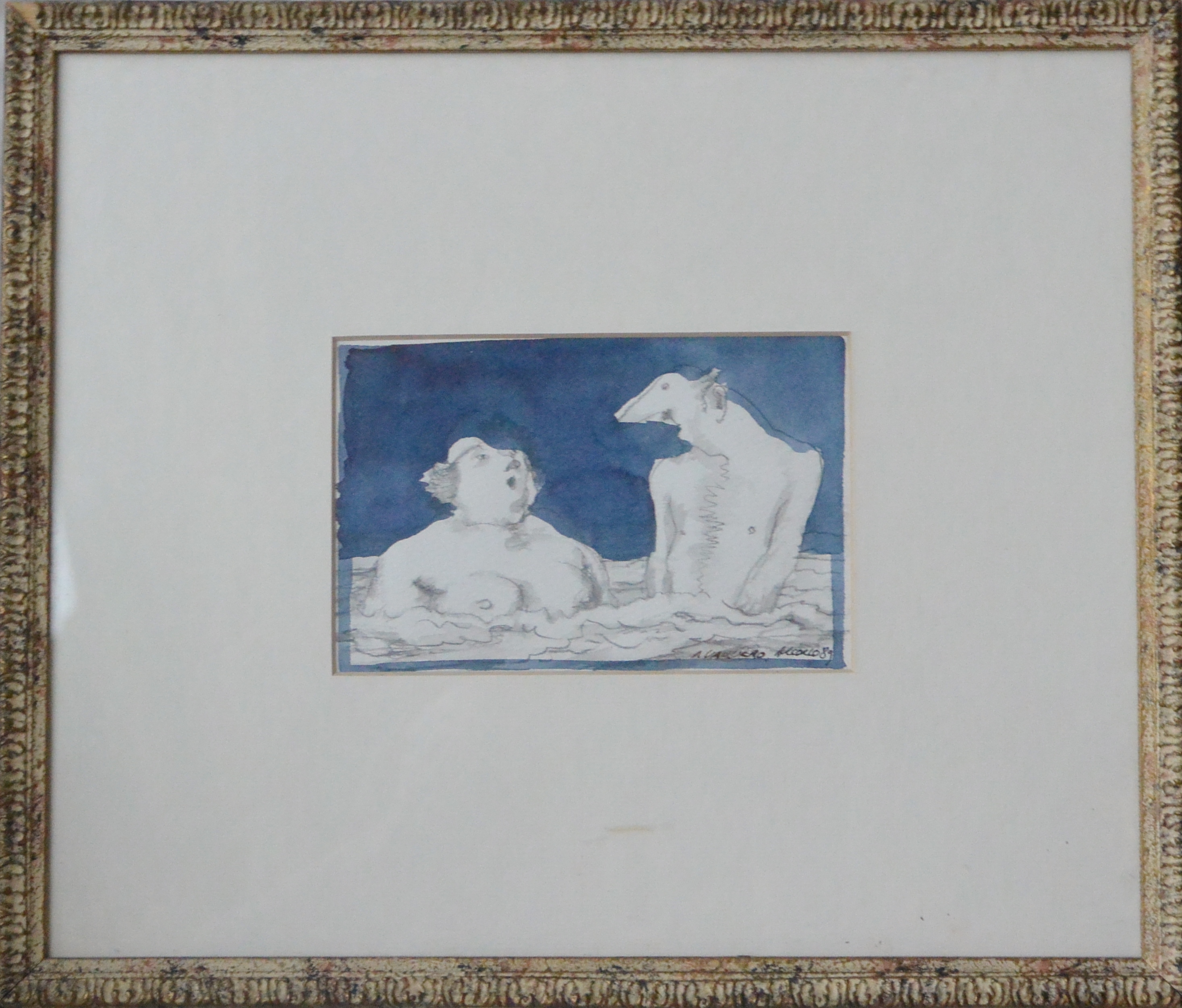 Manuel Alcorlo, en el baño, dibujo técnica mixta cartulina, enmarcado dibujo 10×15 cms. y marco 28×33 cms.