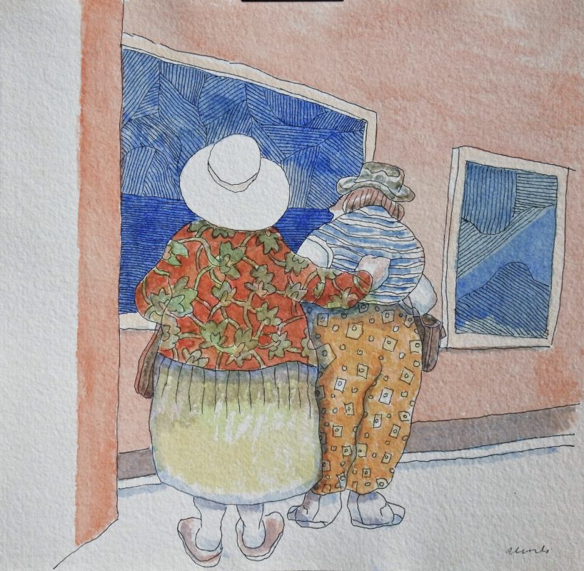 Manuel Alcorlo, En la exposición, dibujo tinta y acuarela cartulina, enmarcado, dibujo 21,50×22 cms. y marco 34×36,50 cms.