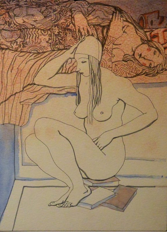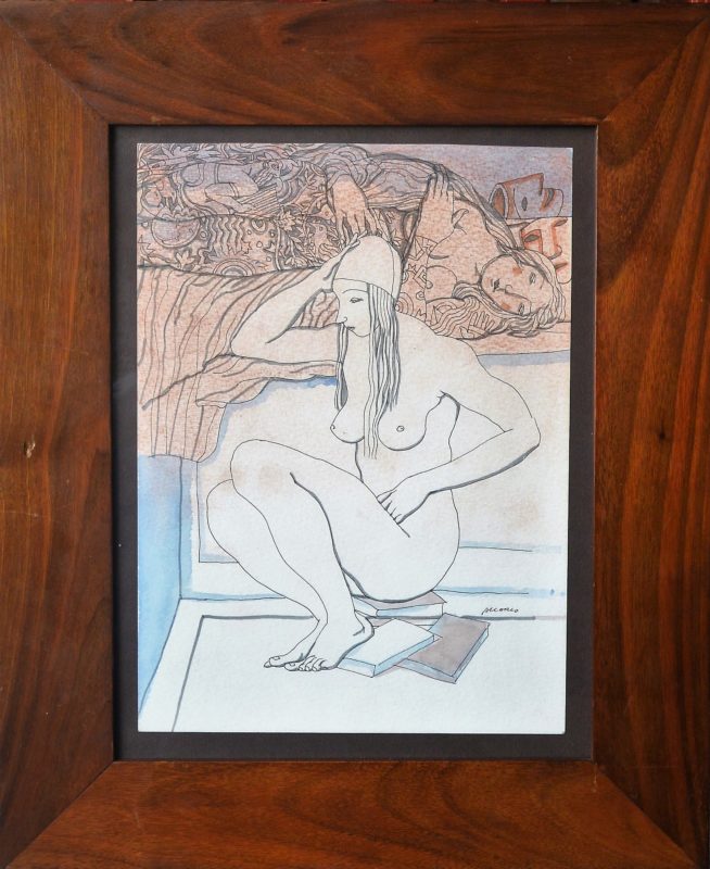 Manuel Alcorlo, Joven desnuda sentada en los libros, dibujo técnica mixta cartulina, enmarcado, dibujo 28,50×21 cms. y marco 42,50×35 cms.