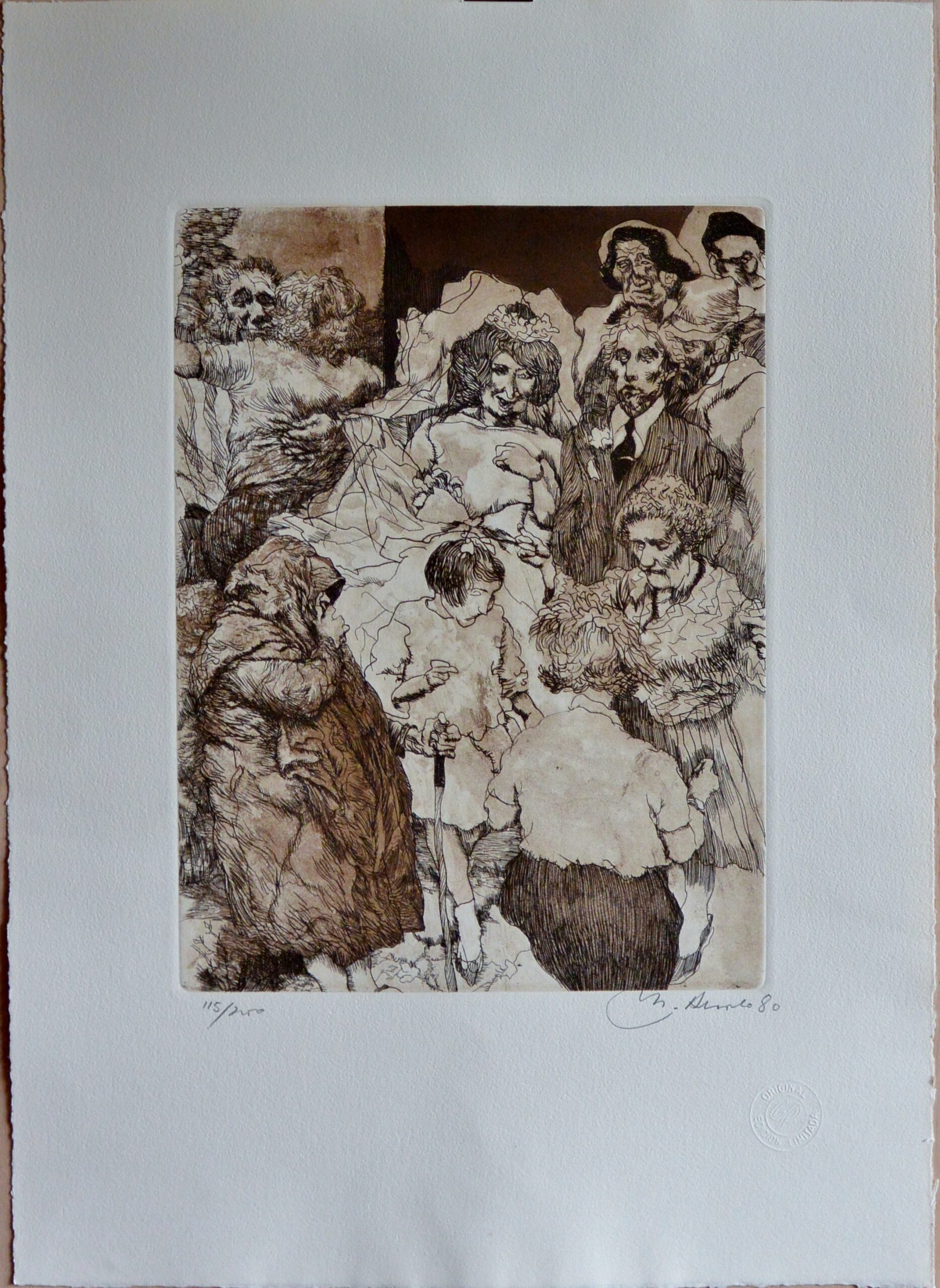 Manuel Alcorlo, La boda, grabado, edición 200 ejemplares, numerado, datado y firmado a lápiz, huella 32×24 cms. y papel 53×38 cms.