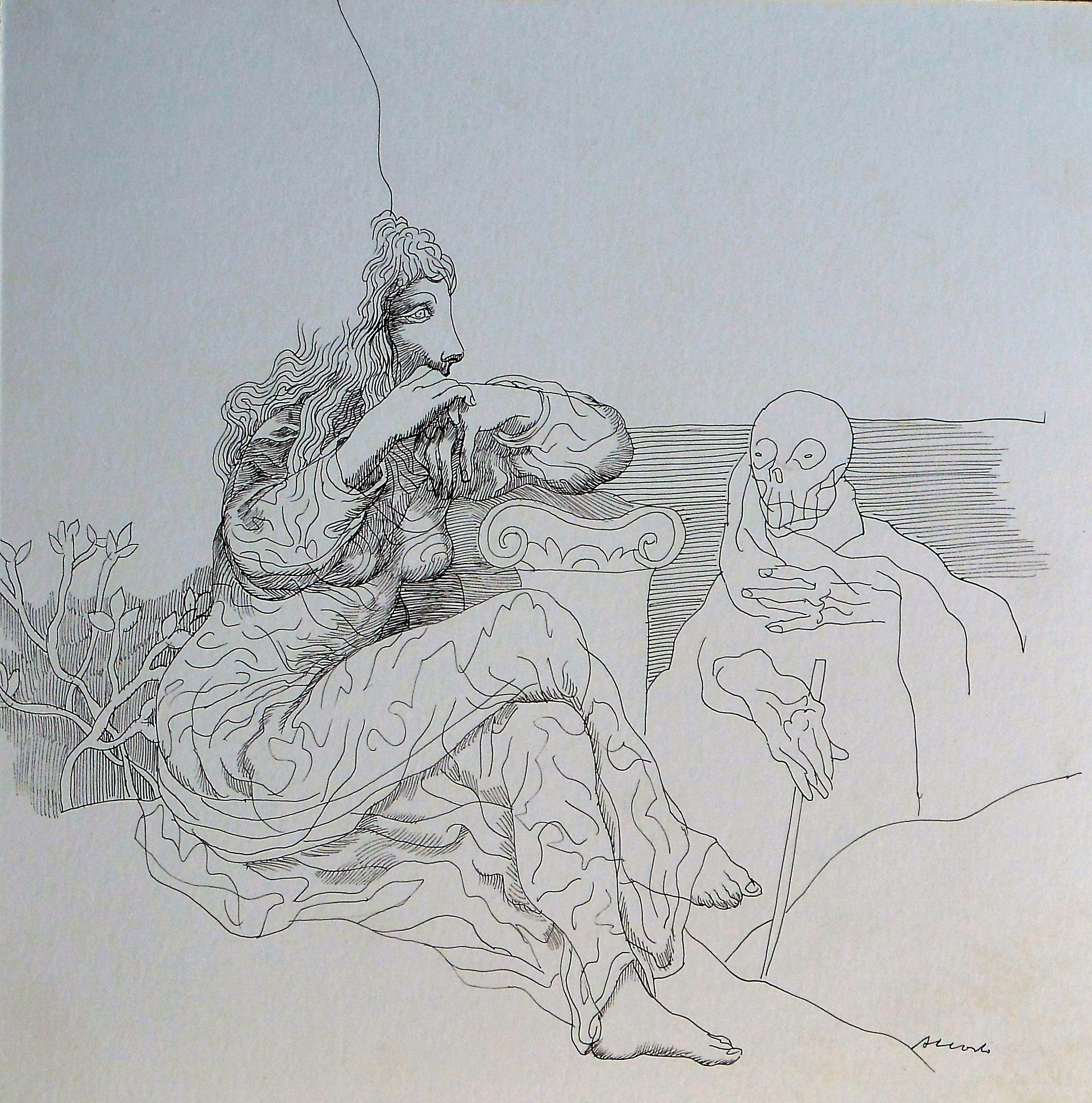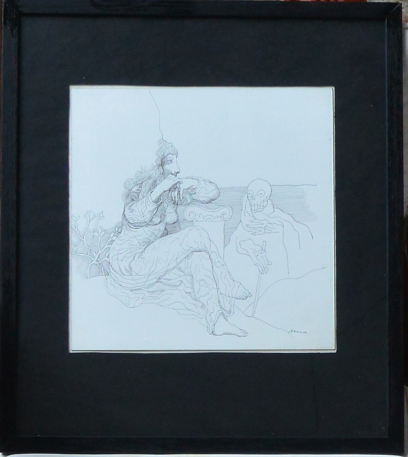 Manuel Alcorlo, La muerte y la doncella, dibujo tinta cartulina, enmarcado, dibujo 30×30 cms. y marco 52×46 cms.