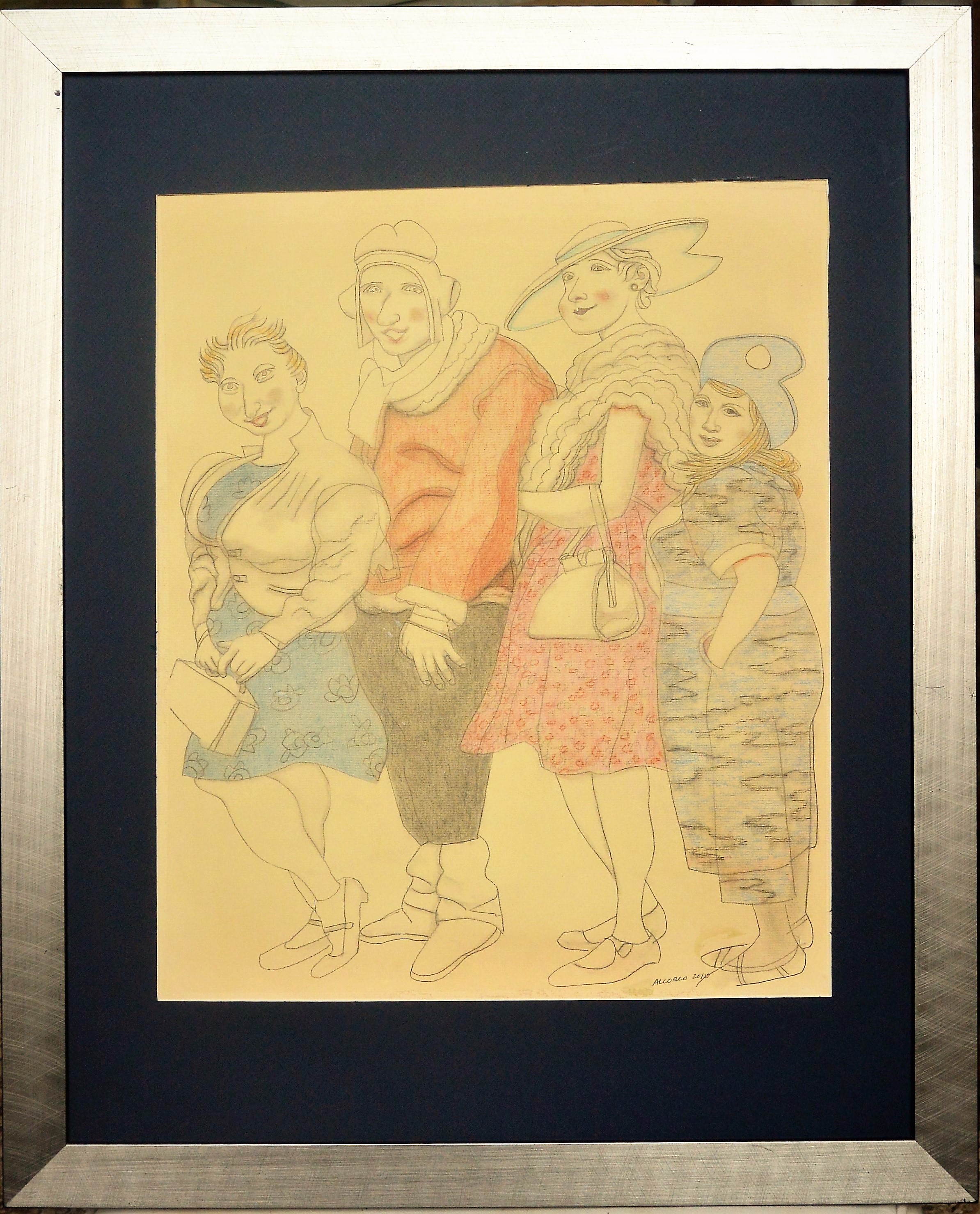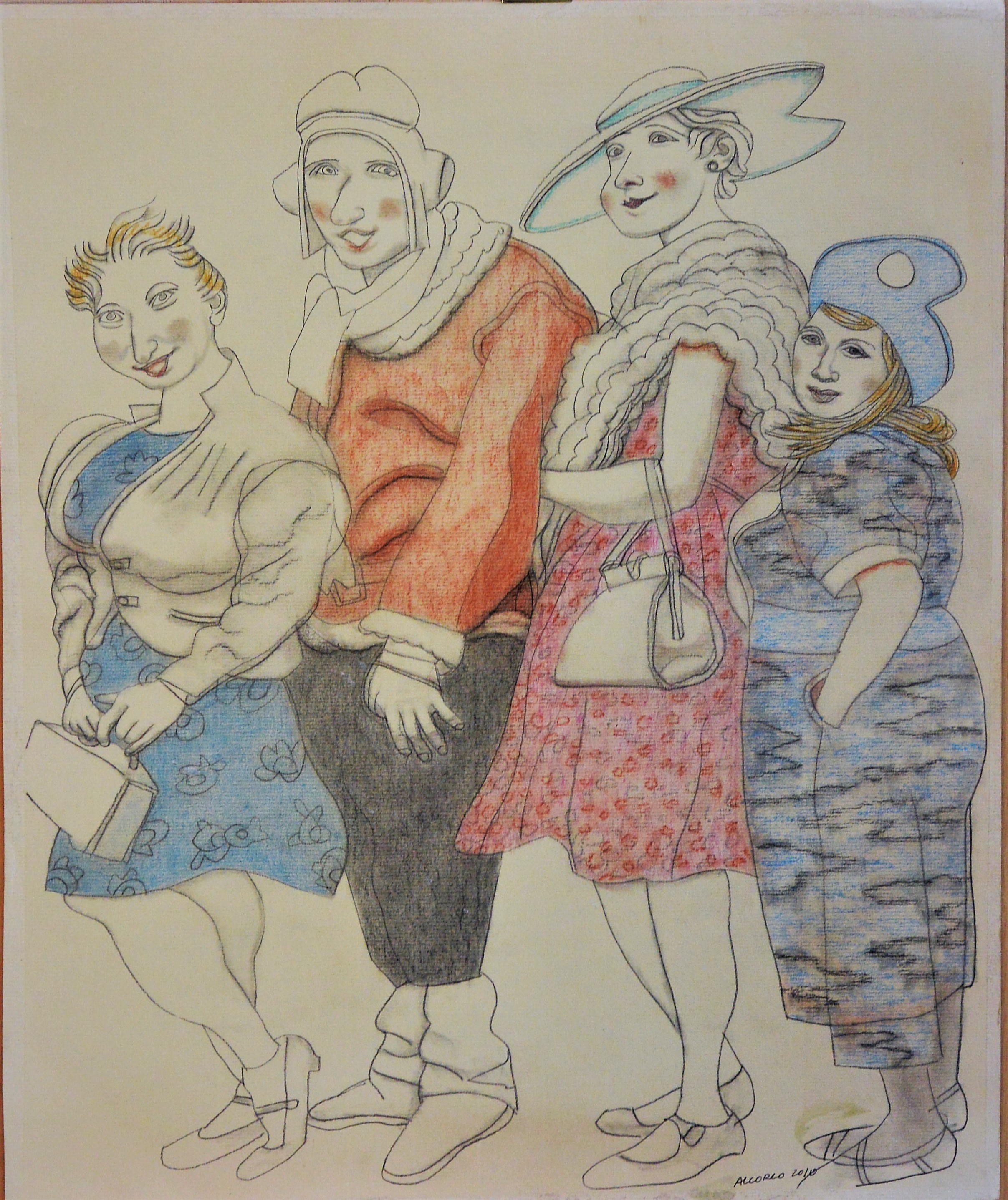 Manuel Alcorlo, Las four sisters, dibujo lápiz y acuarela papel, enmarcado, dibujo 50×41 cms. y marco 73×59 cms.