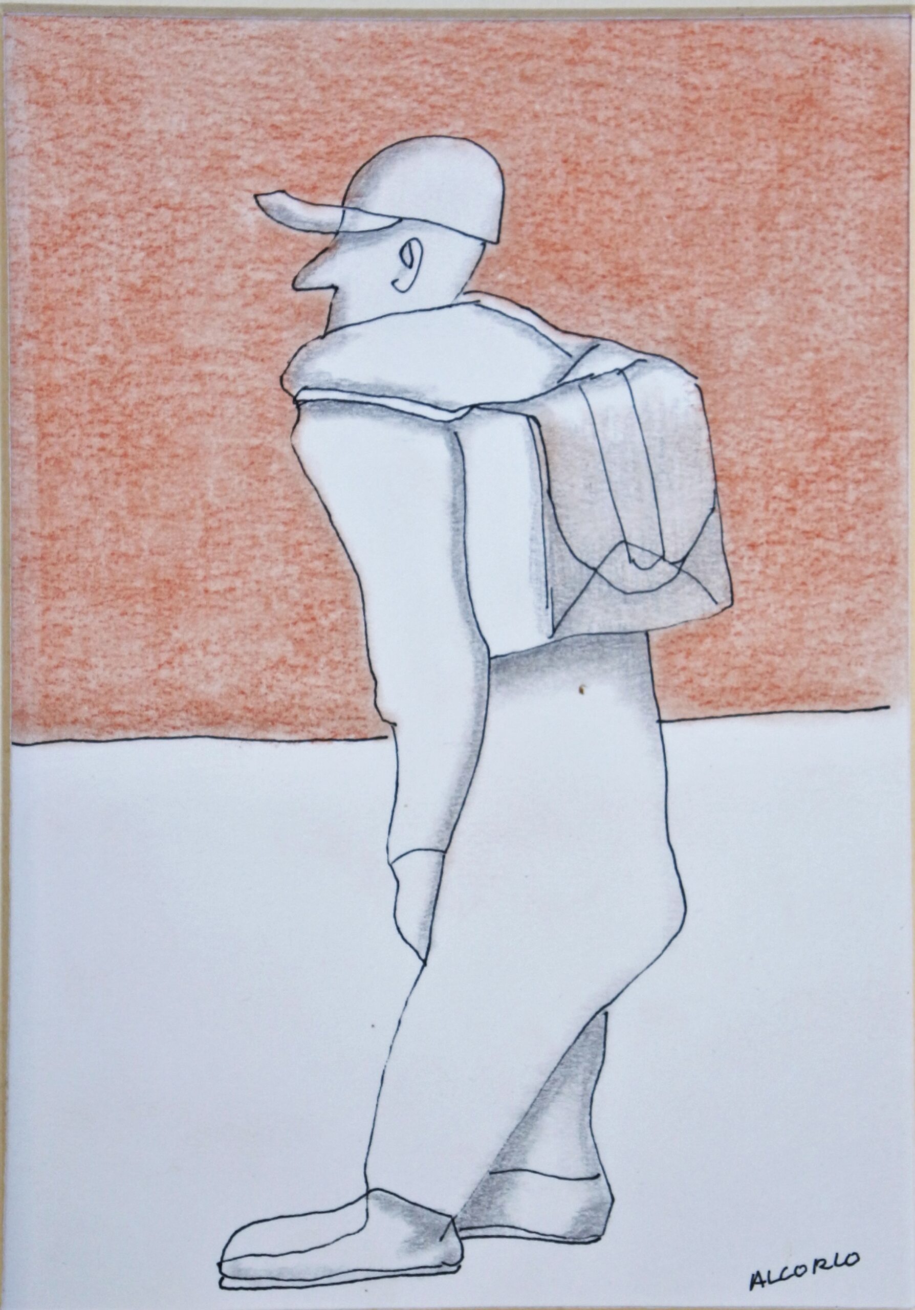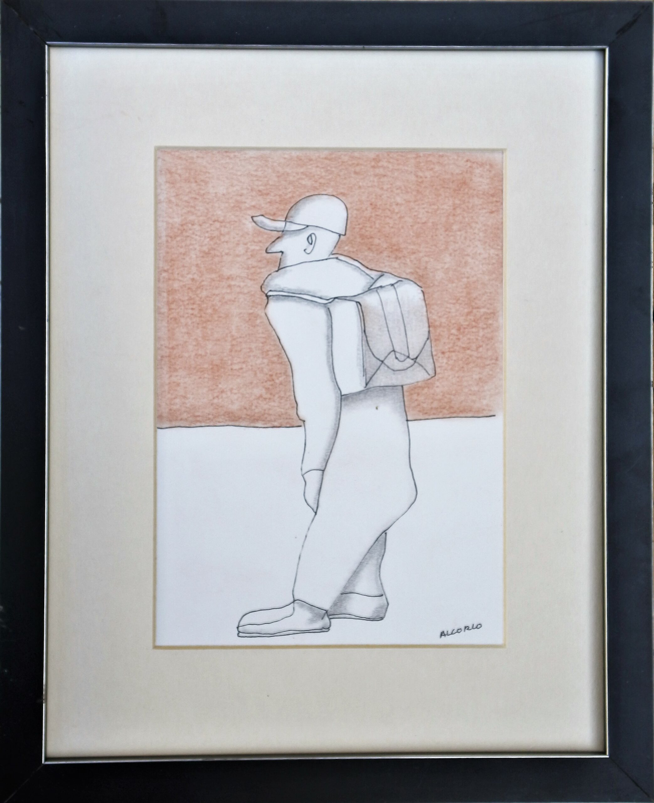 Manuel Alcorlo, Mochilero, dibujo original lápiz y acuarela sobre cartulina, enmarcado, dibujo 18×13 cms. y marco 27×22 cms.