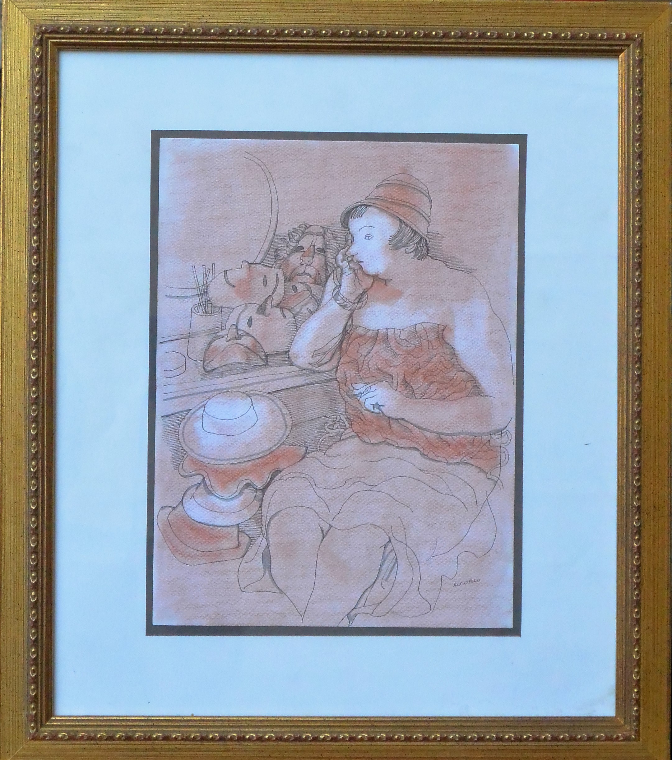 Manuel Alcorlo, Reflexión en el camerino, dibujo tinta y pastel papel, enmarcado, dibujo 28×21 cms. y marco 45×39 cms.