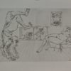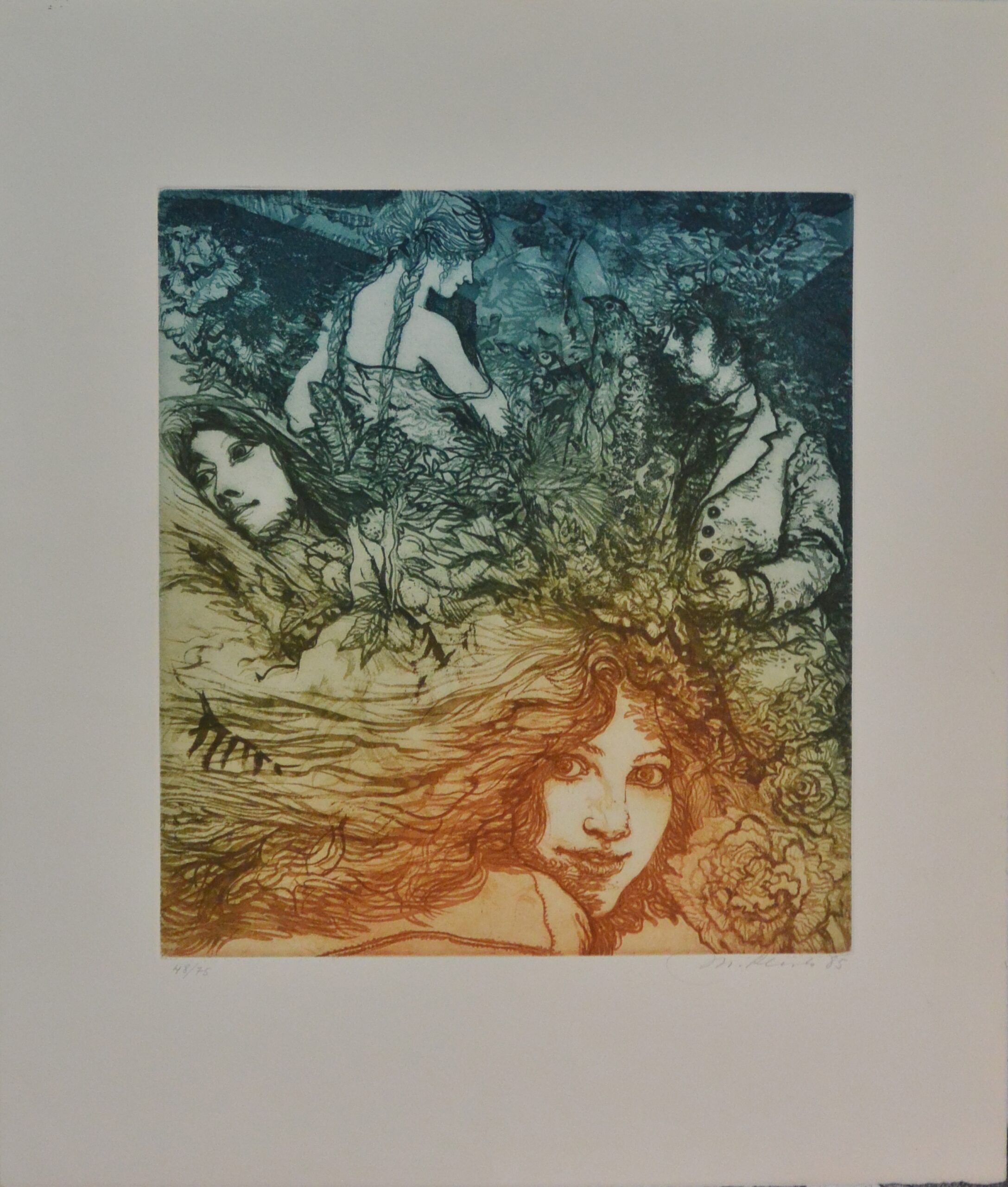 Manuel Alcorlo, Cuatro personajes, Grabado, edición 75 ejemplares, numerado y firmado a lápiz 48/75 en 1985, plancha: 36X32,5 cms y papel: 56,5X48 cms.