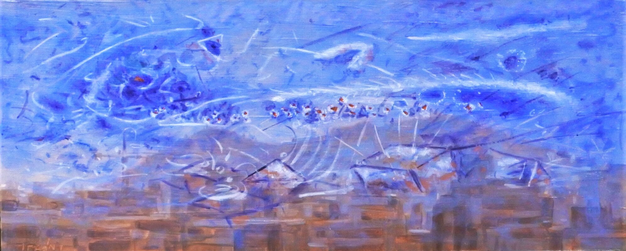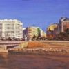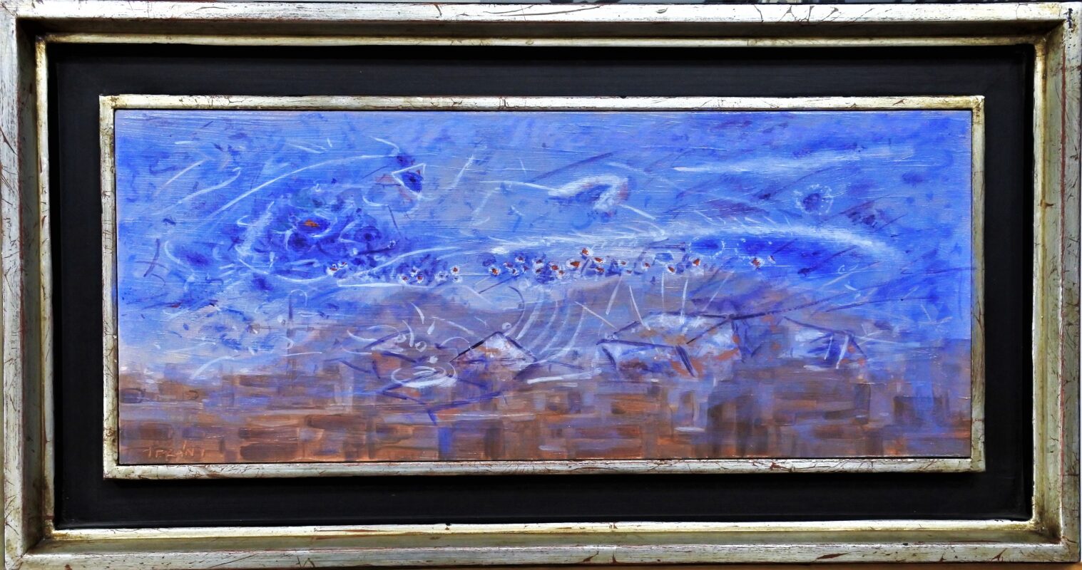 Manuel Terán, Santiago, San Cristóbal desde Providencia, ecléctico tributo a los genios, Roberto Matta, pintura oleo sobre tabla, enmarcado, pintura 16×40 cms. y marco 26,50×50 cms