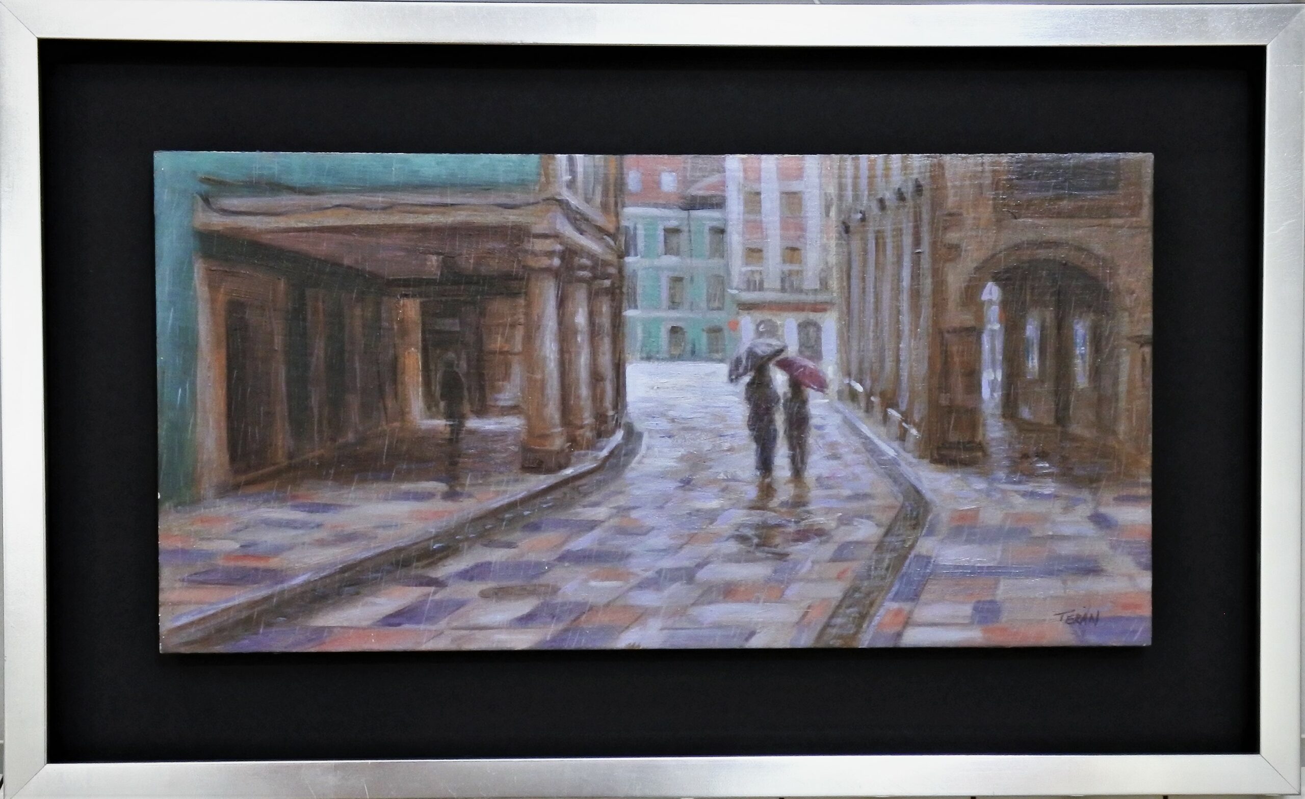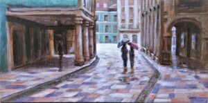 Manuel Terán, A propósito de la lluvia, Avilés II, pintura oleo sobre tabla, enmarcado, pintura 20×40 cms. y marco 32×52 cms.