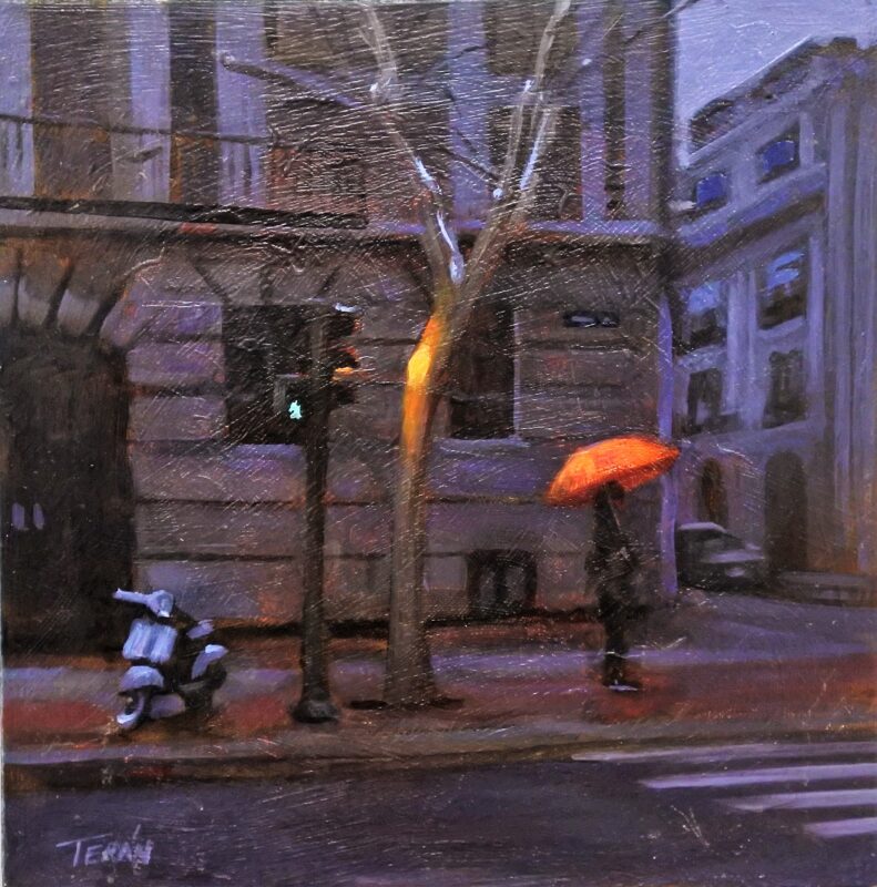Manuel Terán, A propósito de la lluvia, Paraguas rojo, pintura oleo sobre tabla, 20×20 cms.