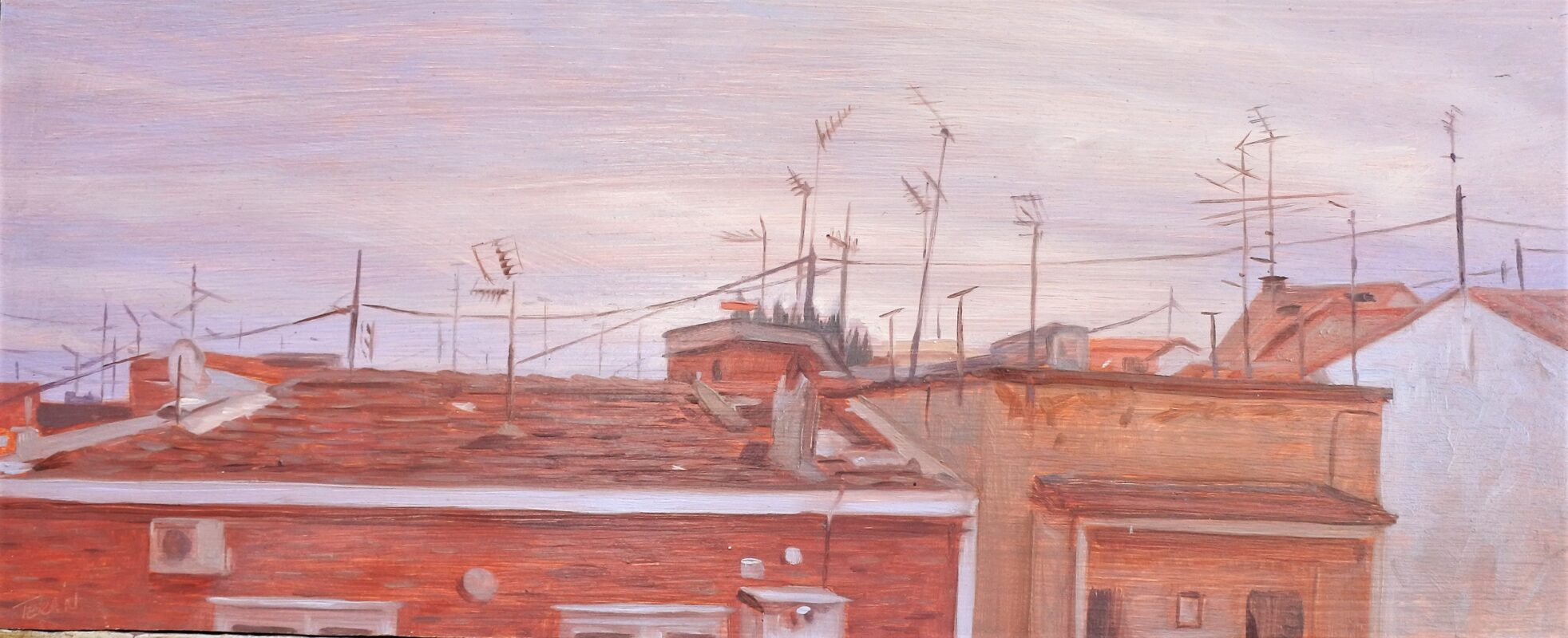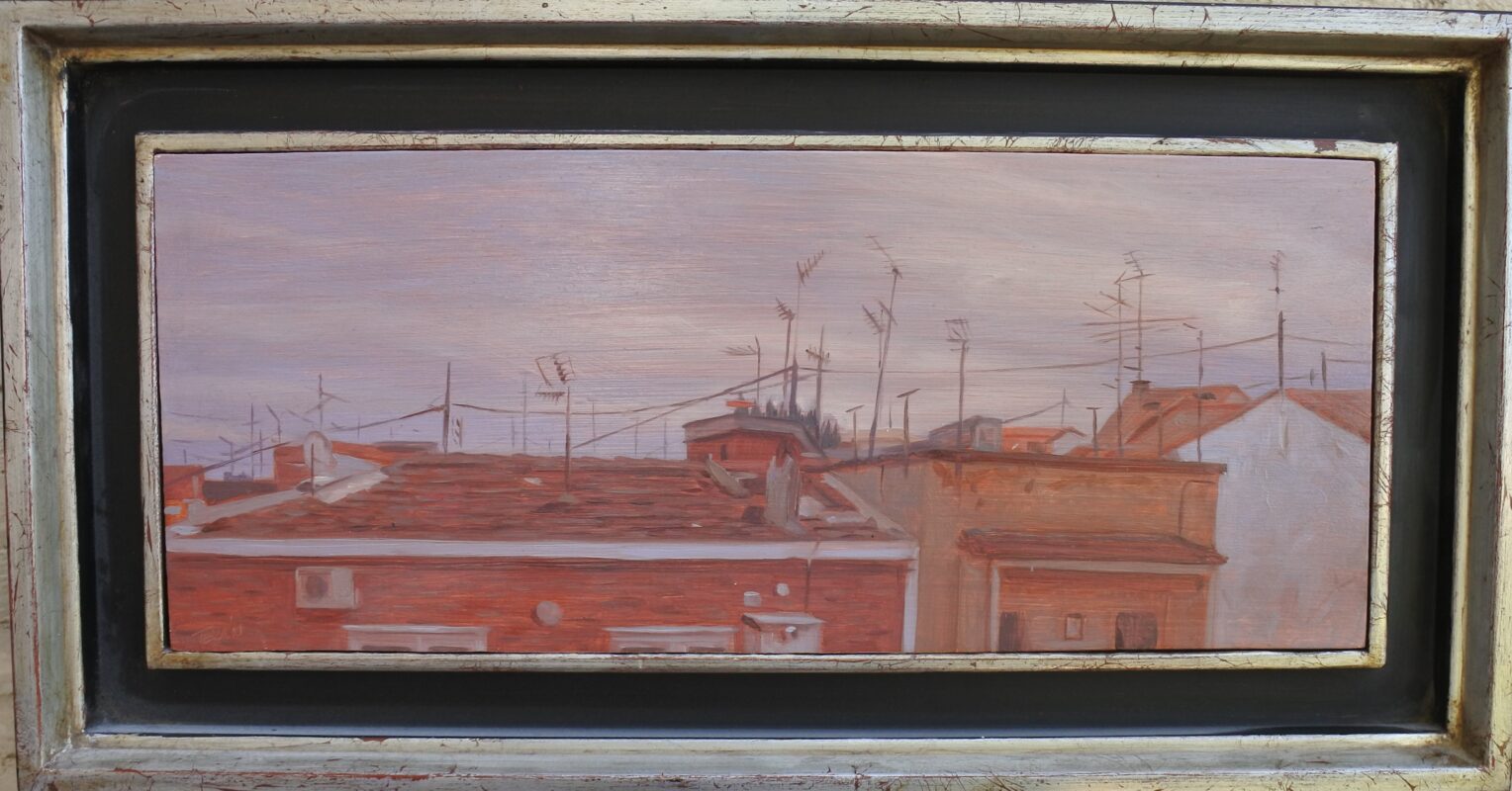 Manuel Terán, Barrio de Usera, Madrid, tejados, pintura oleo sobre tabla, con marco artesanal, pintura 16×40 cms. y marco 26×50 cms