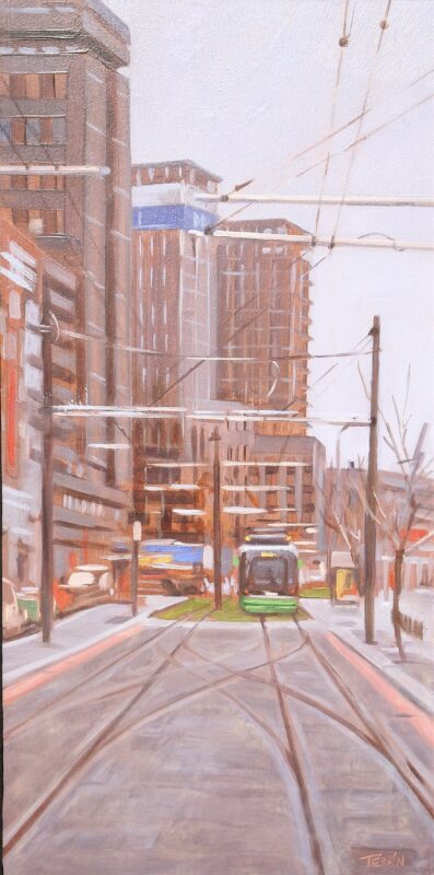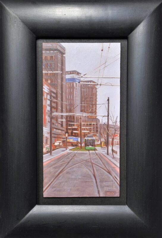 Manuel Terán, Bilbao, Vista urbana con tranvía, pintura técnica mixta sobre tabla, con marco artesanal, pintura 40×20 cms. y marco 60×42 cms.