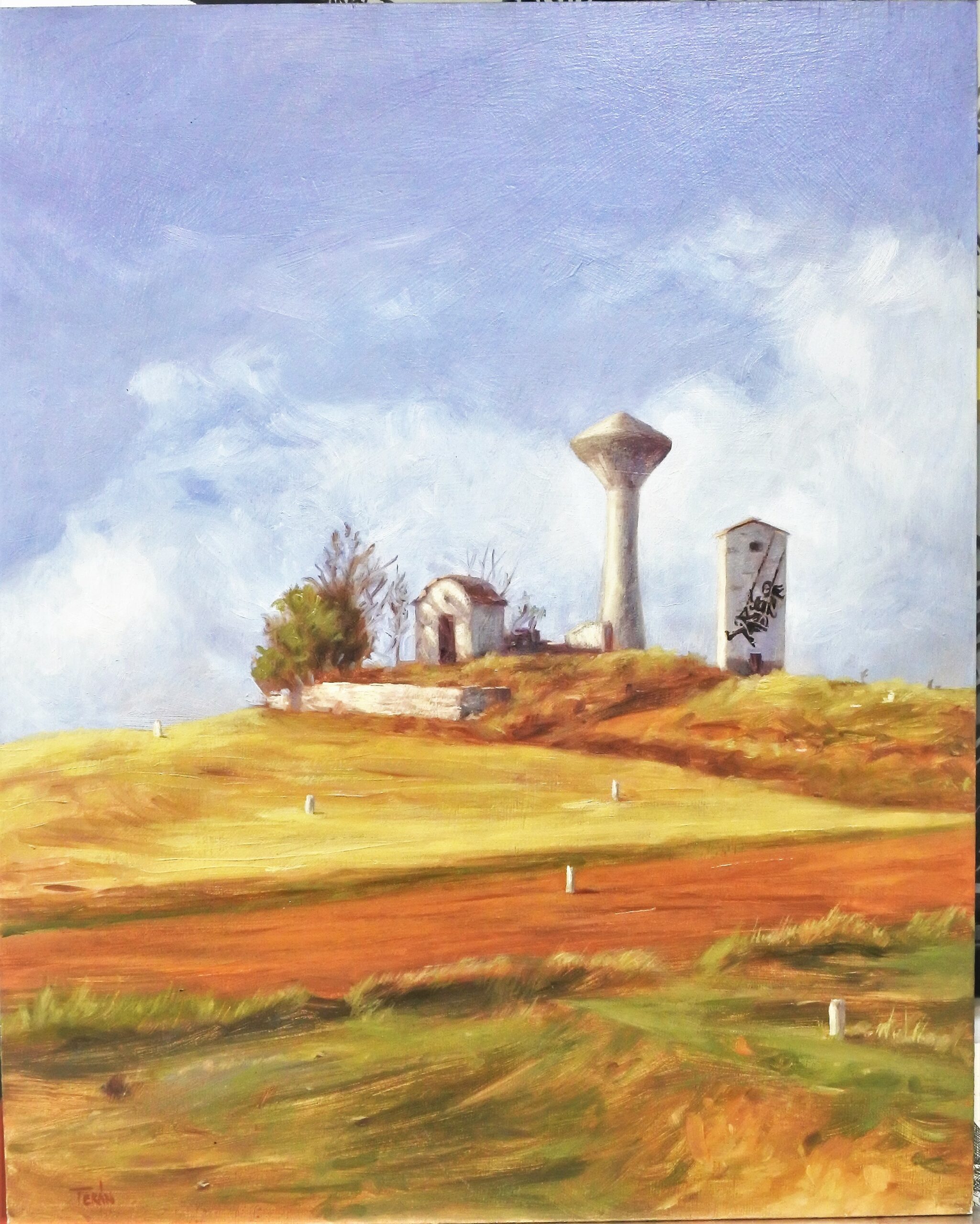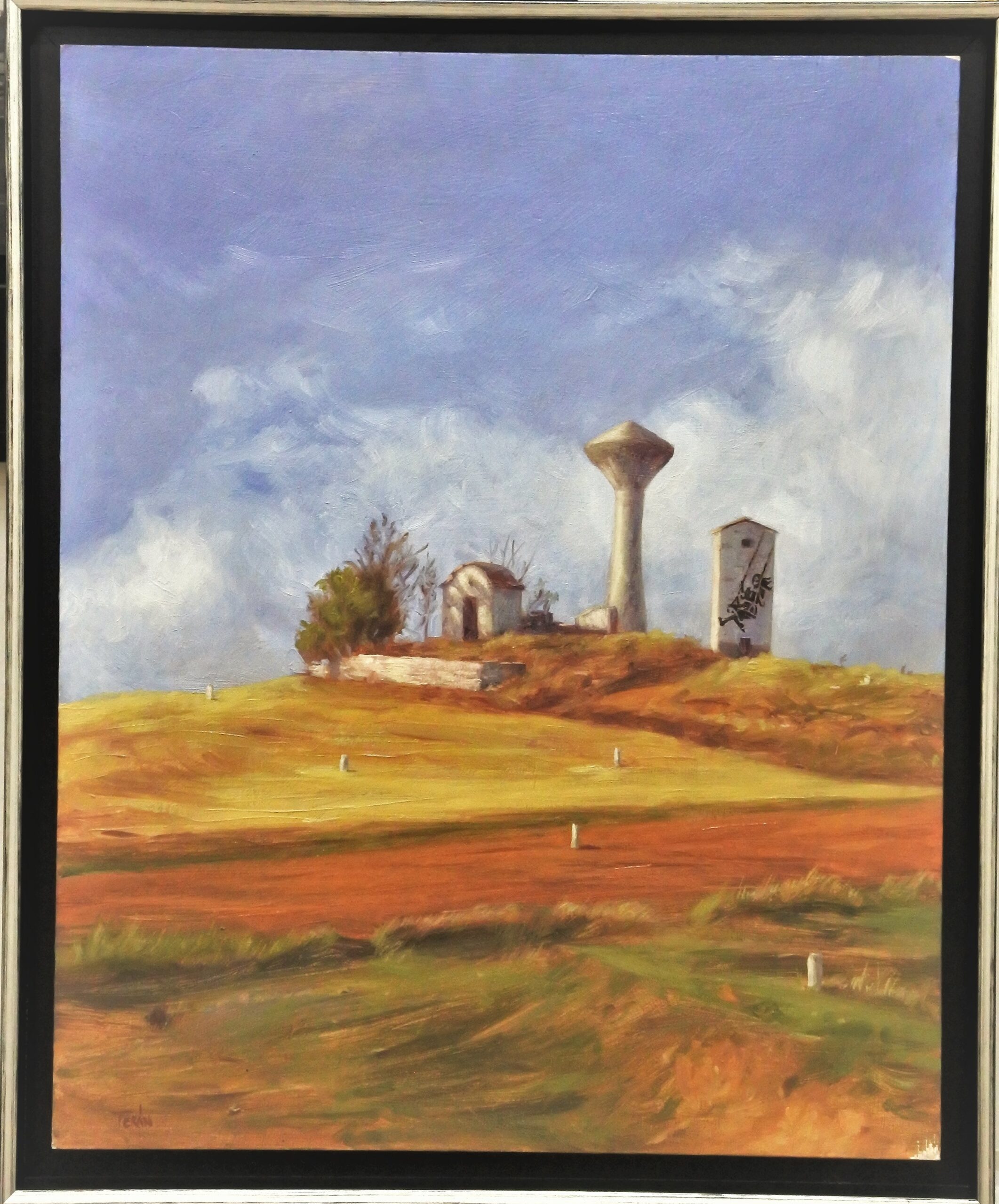 Manuel Terán, Ecléctico tributo a los genios, Banksy, paisaje, pintura oleo sobre tabla, enmarcado, pintura 50×40 cms. y marco 54×44 cms.