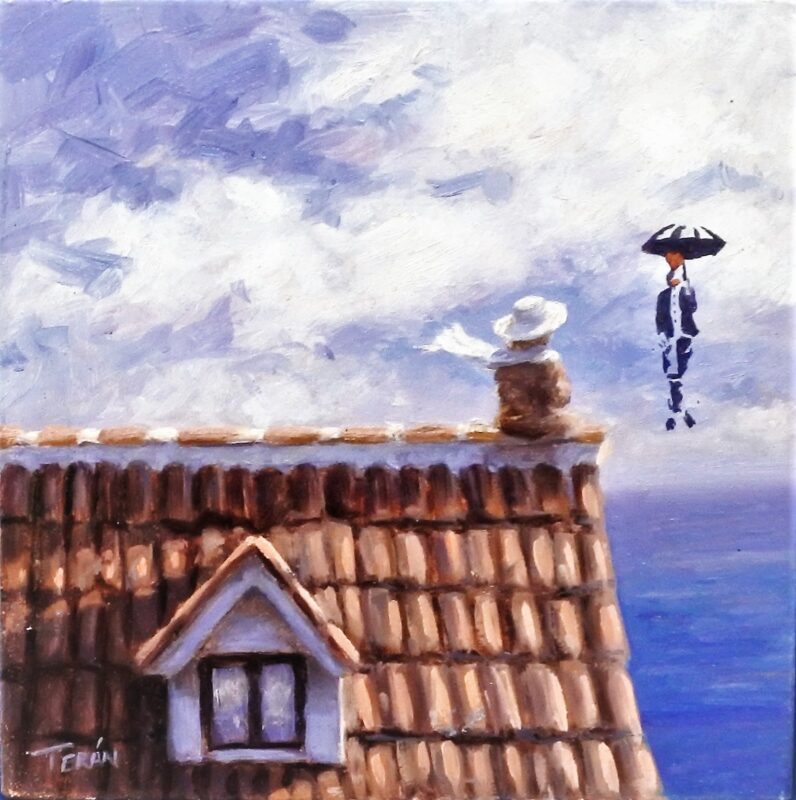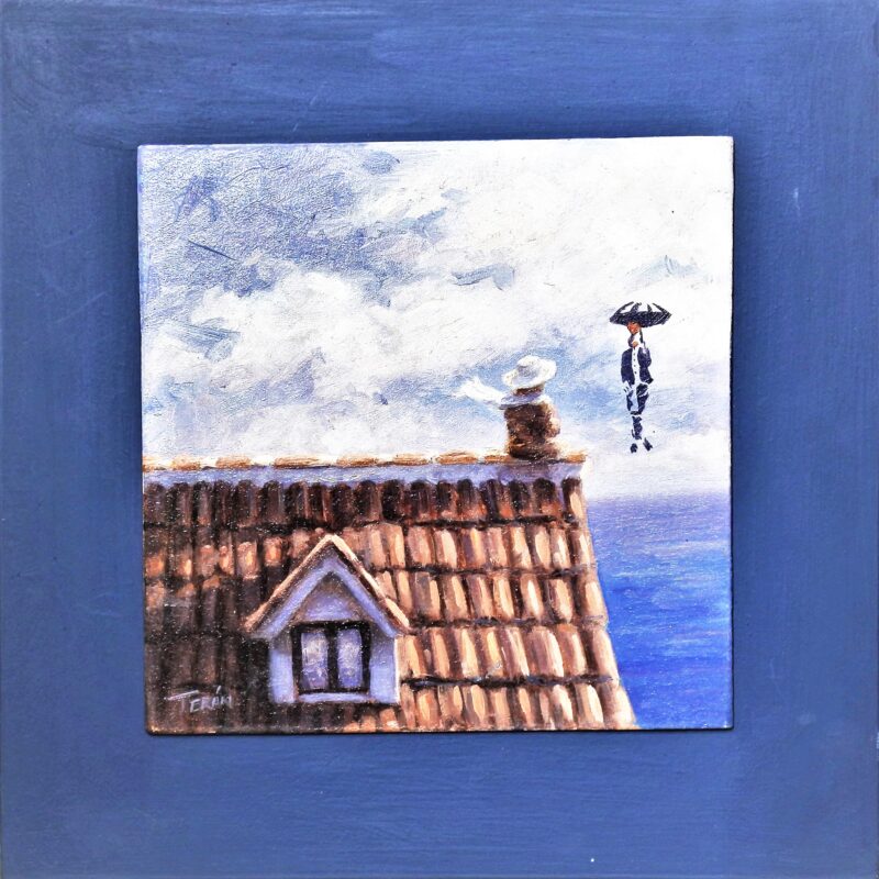 Manuel Terán, Ecléctico tributo a los genios, Banksy, pintura oleo sobre tabla con soporte pintado por el artista, pintura 20×20 cms. y soporte 30×30 cms.