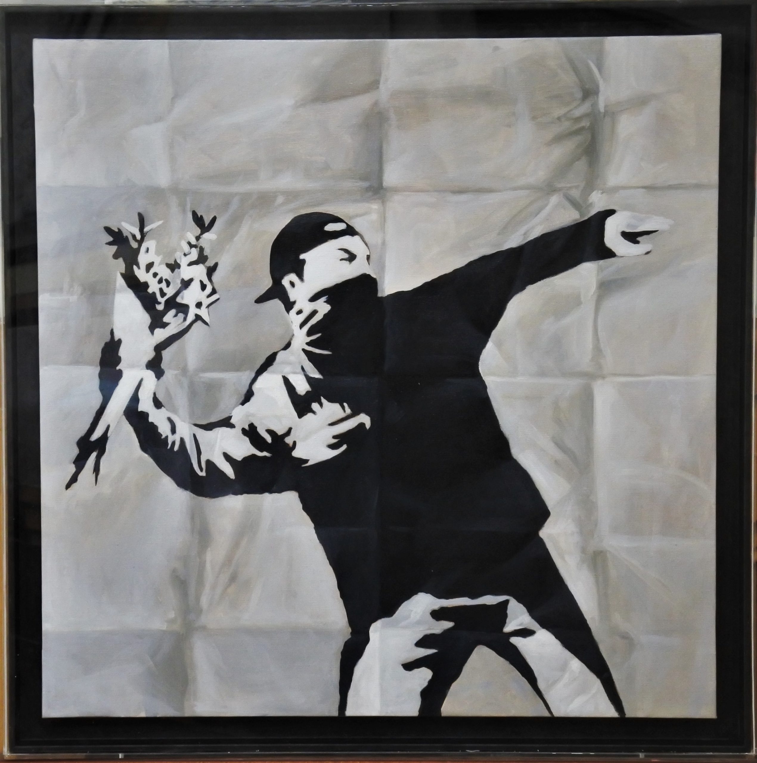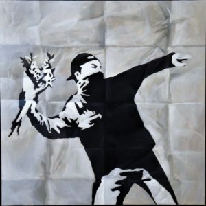 Manuel Terán, Ecléctico tributo a los genios, Banksy, pintura oleo sobre lienzo, enmarcado en caja de metacrilato, pintura 60×60 cms. y con marco 67×67 cms.