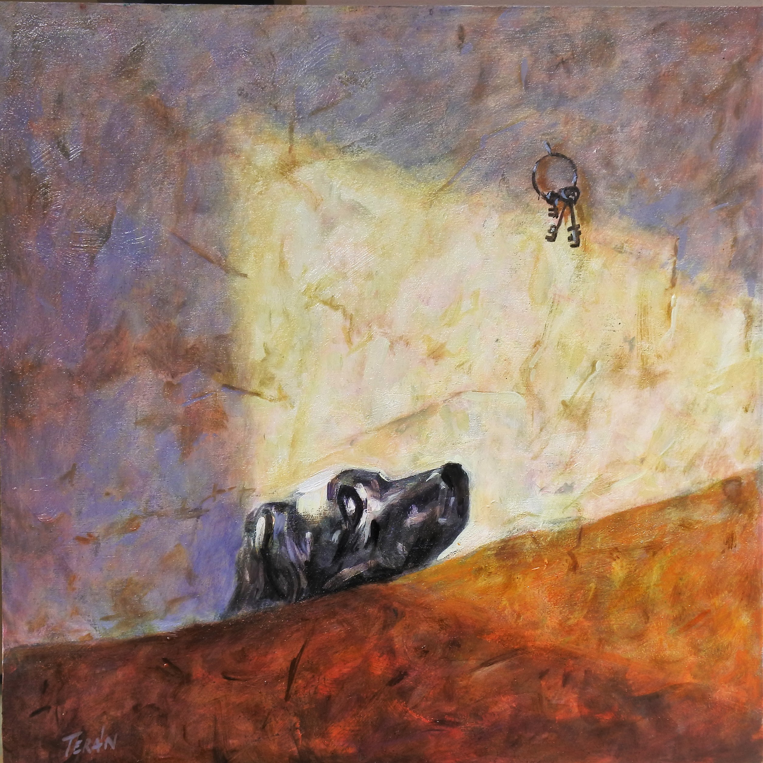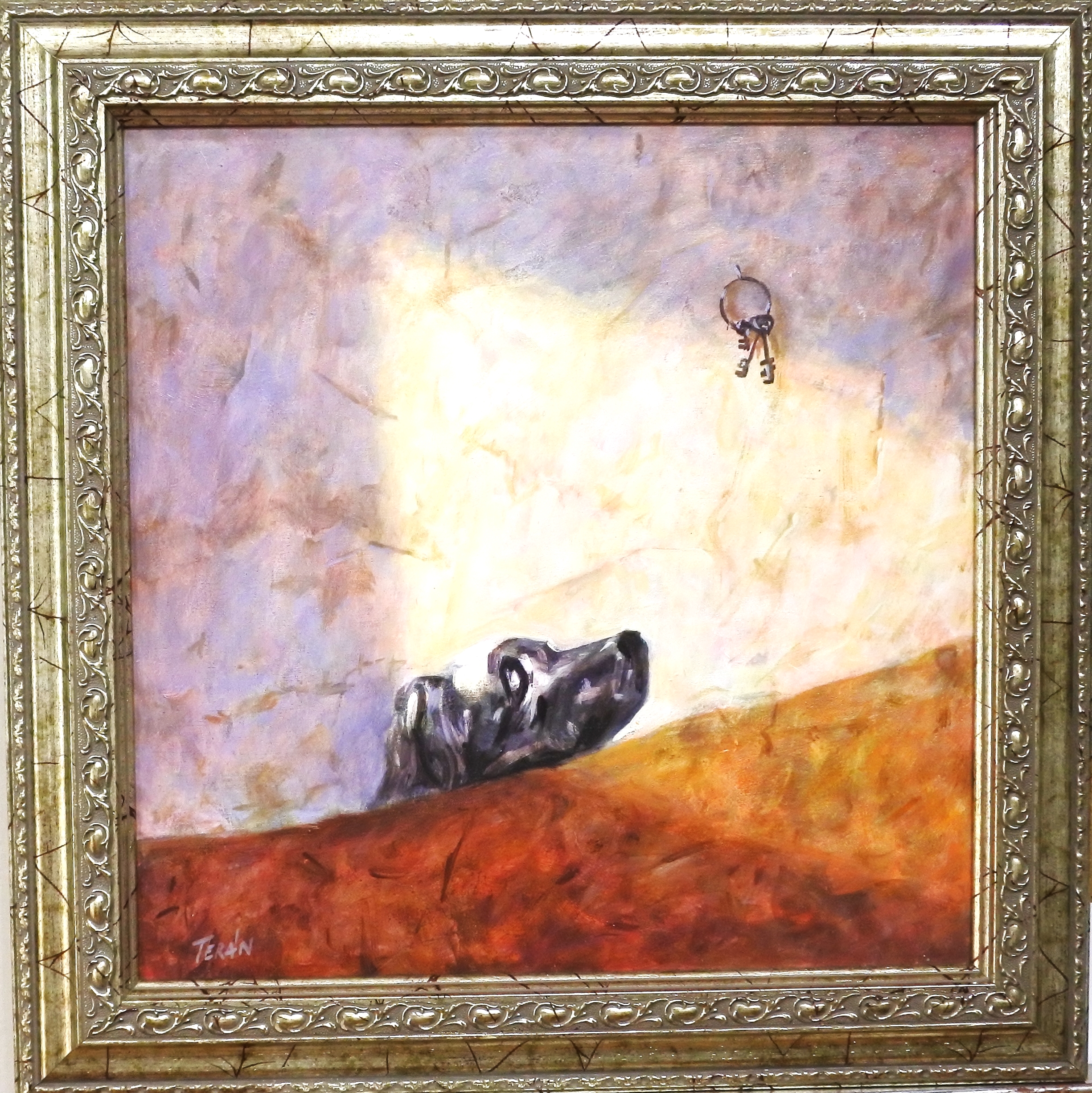 Manuel Terán, Ecléctico tributo a los genios, Goya, perro hundido, pintura oleo sobre tabla, enmarcado, pintura 30×30 cms. y marco 38,50×38,50 cms.