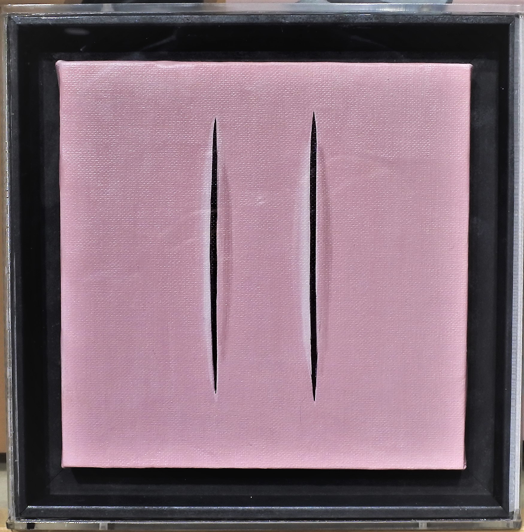 Manuel Teran, Ecléctico tributo a los genios, Lucio Fontana, incisión sobre rosa, pintura oleo sobre lienzo, enmarcado y caja de metacrilato, pintura 20×20 cms. y caja 26×26 cms.