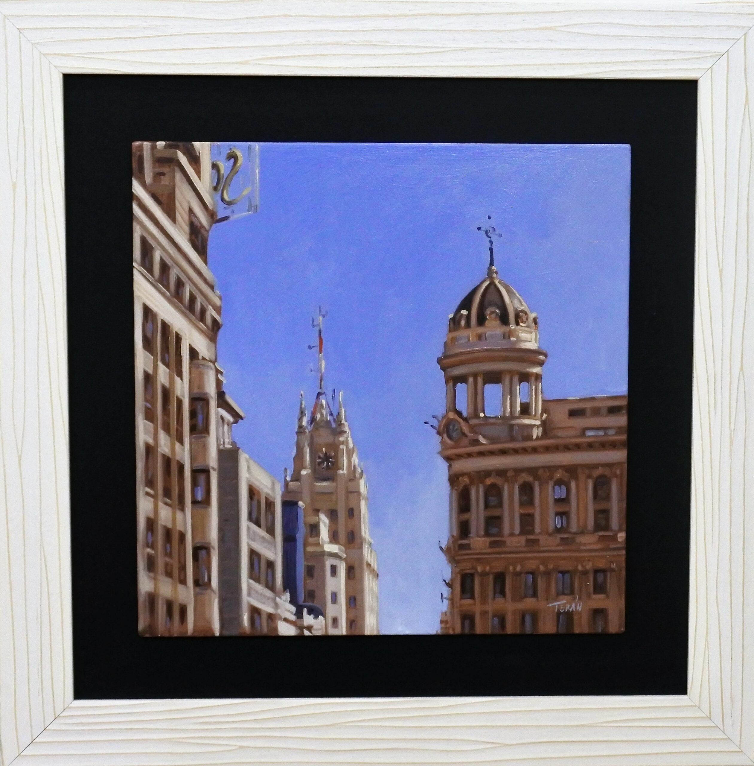 Manuel Terán, Madrid, Gran Vía con Calle Montera, pintura oleo sobre tabla, enmarcado, pintura 30×30 cms. y marco 48×48 cms.