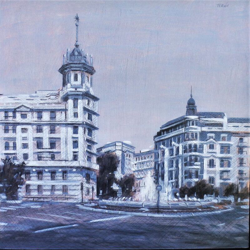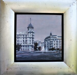 Manuel Terán, Madrid, Plaza de Alonso Martinez, pintura oleo sobre tabla, enmarcado, pintura 30×30 cms. y marco 51×51 cms.