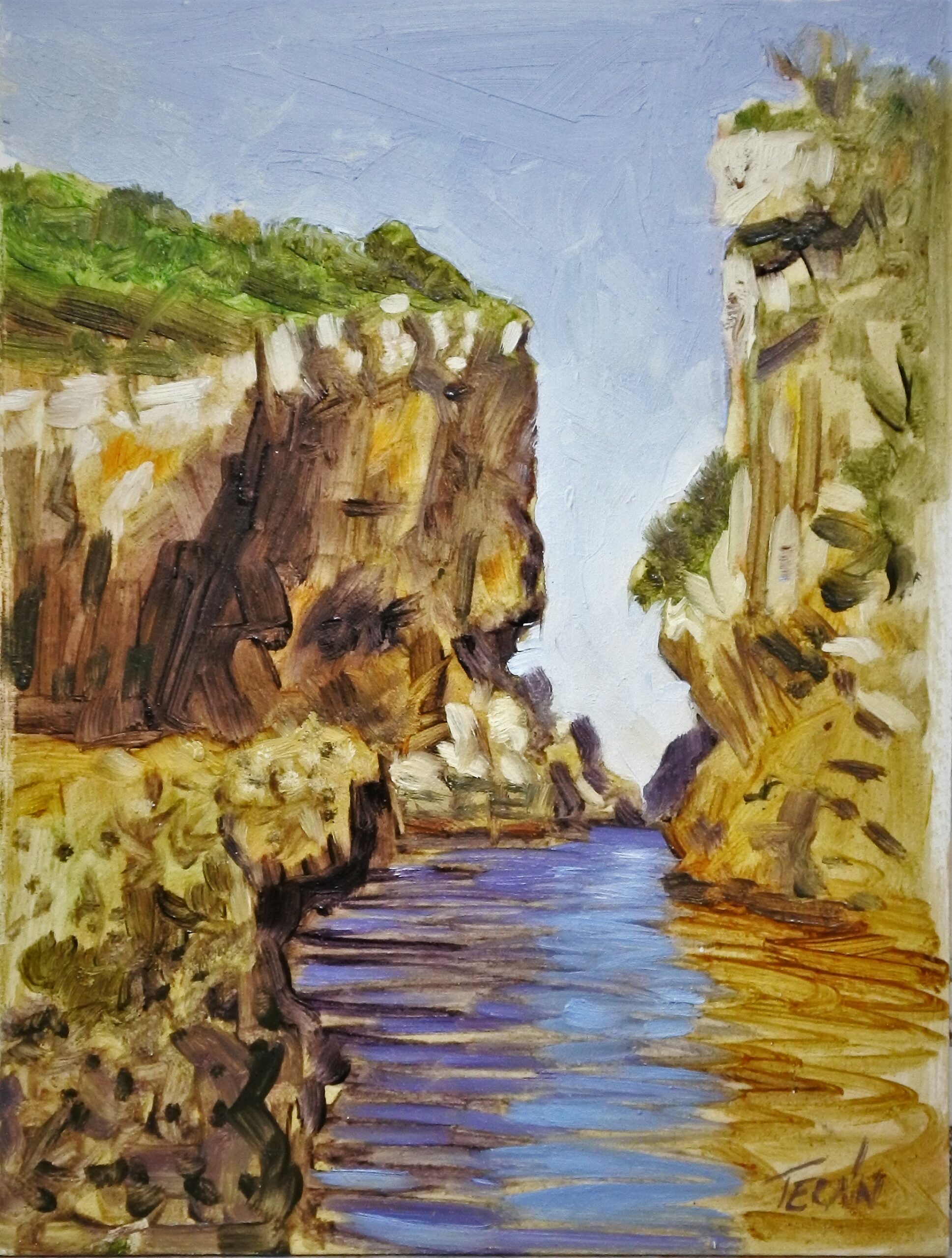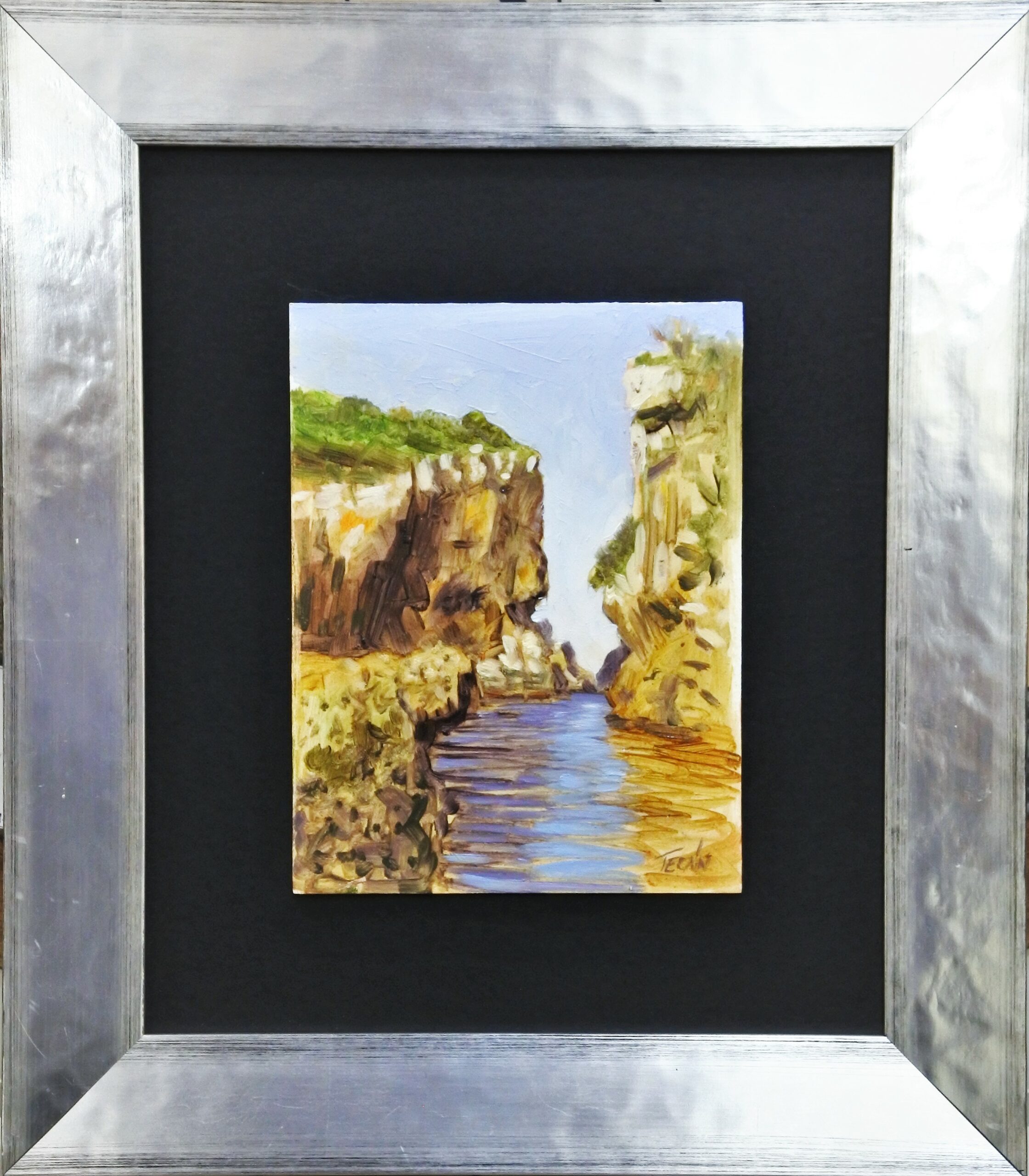 Manuel Terán, Menorca, cala Rafalet, pintura oleo sobre tabla, enmarcado, pintura 21×16 cms. y marco 41,50×36,50 cms.