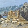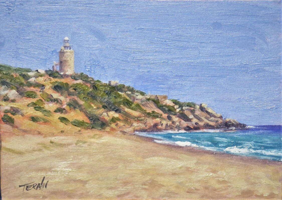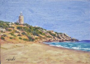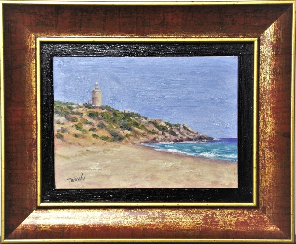 Manuel Terán, Paisaje con faro al fondo, pintura oleo sobre tabla, enmarcado, pintura 12,50×17,50 cms. y marco 23×28 cms.
