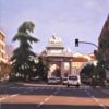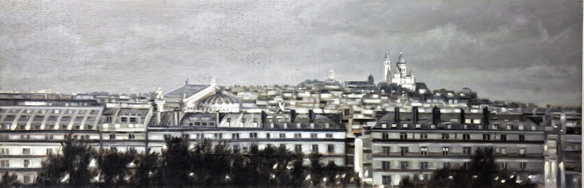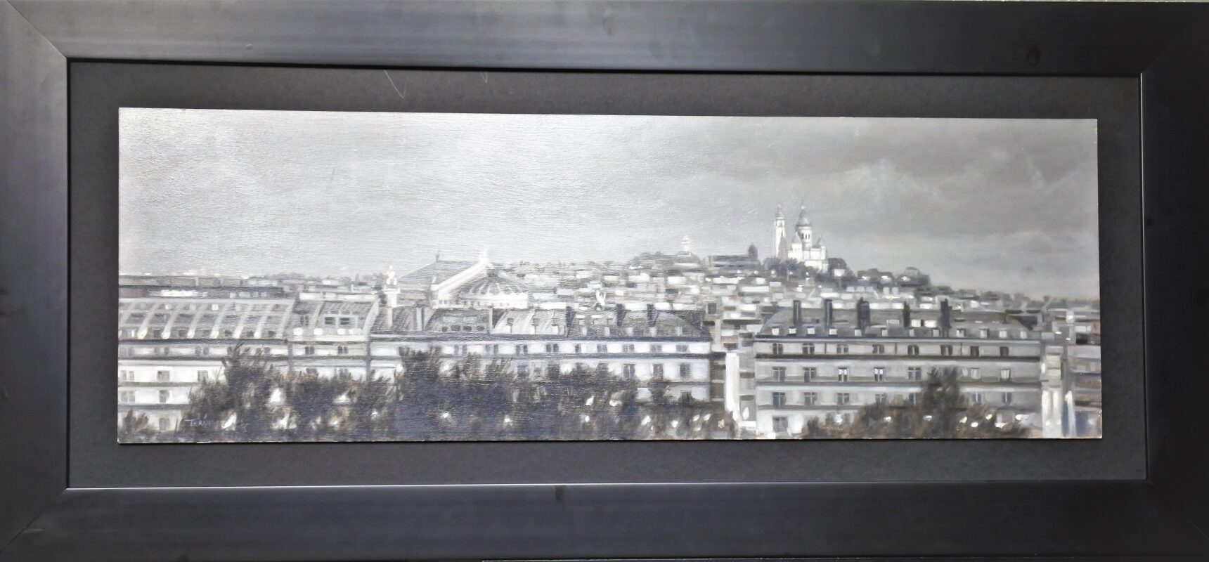 Manuel Terán, Paris, vista panorámica con Sacré Coeur al fondo, pintura oleo tabla, enmarcado, pintura 30×90 cms. y marco 52×112 cms.