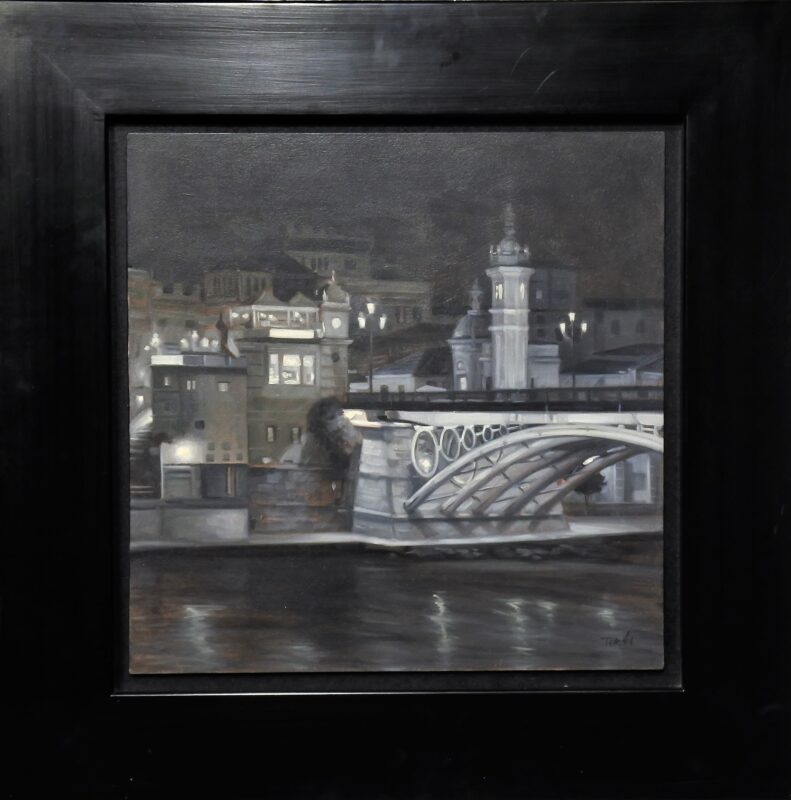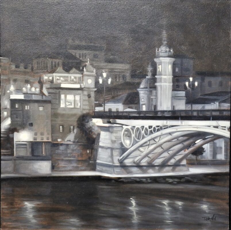 Manuel Terán, Sevilla, Vista urbana nocturna, pintura oleo sobre tabla, con marco artesanal, pintura 40×40 cms. y marco 59×59 cms.