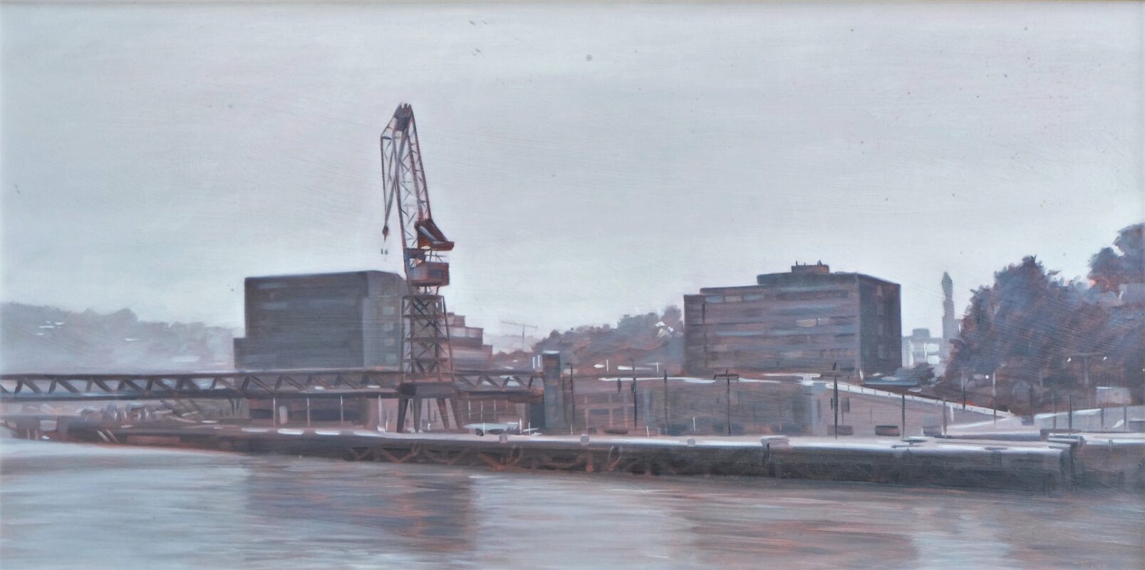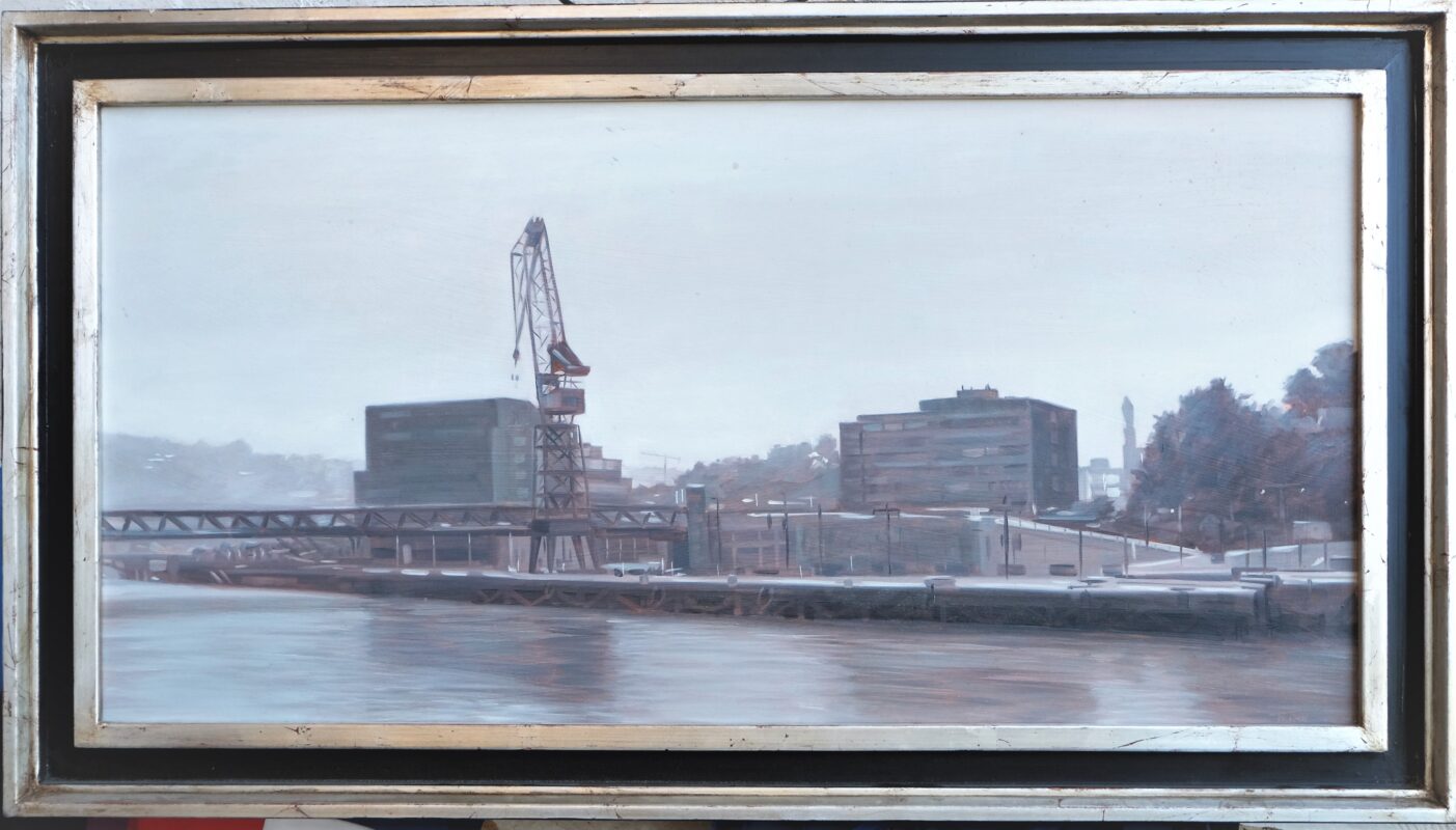 Manuel Terán, Bilbao, vista del puerto, pintura oleo sobre tabla, con marco artesanal, pintura 40×80 cms. y marco 51×91 cms.