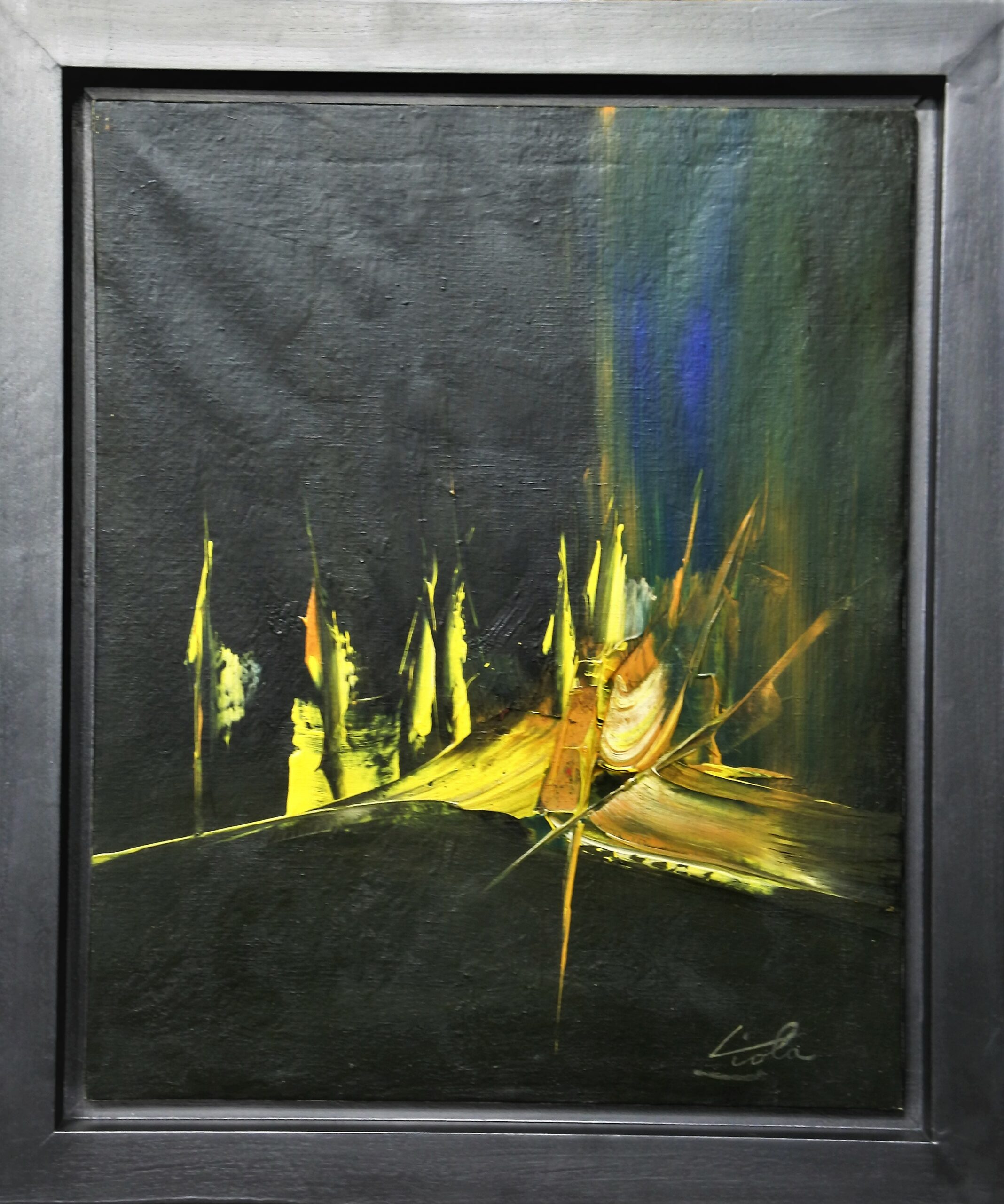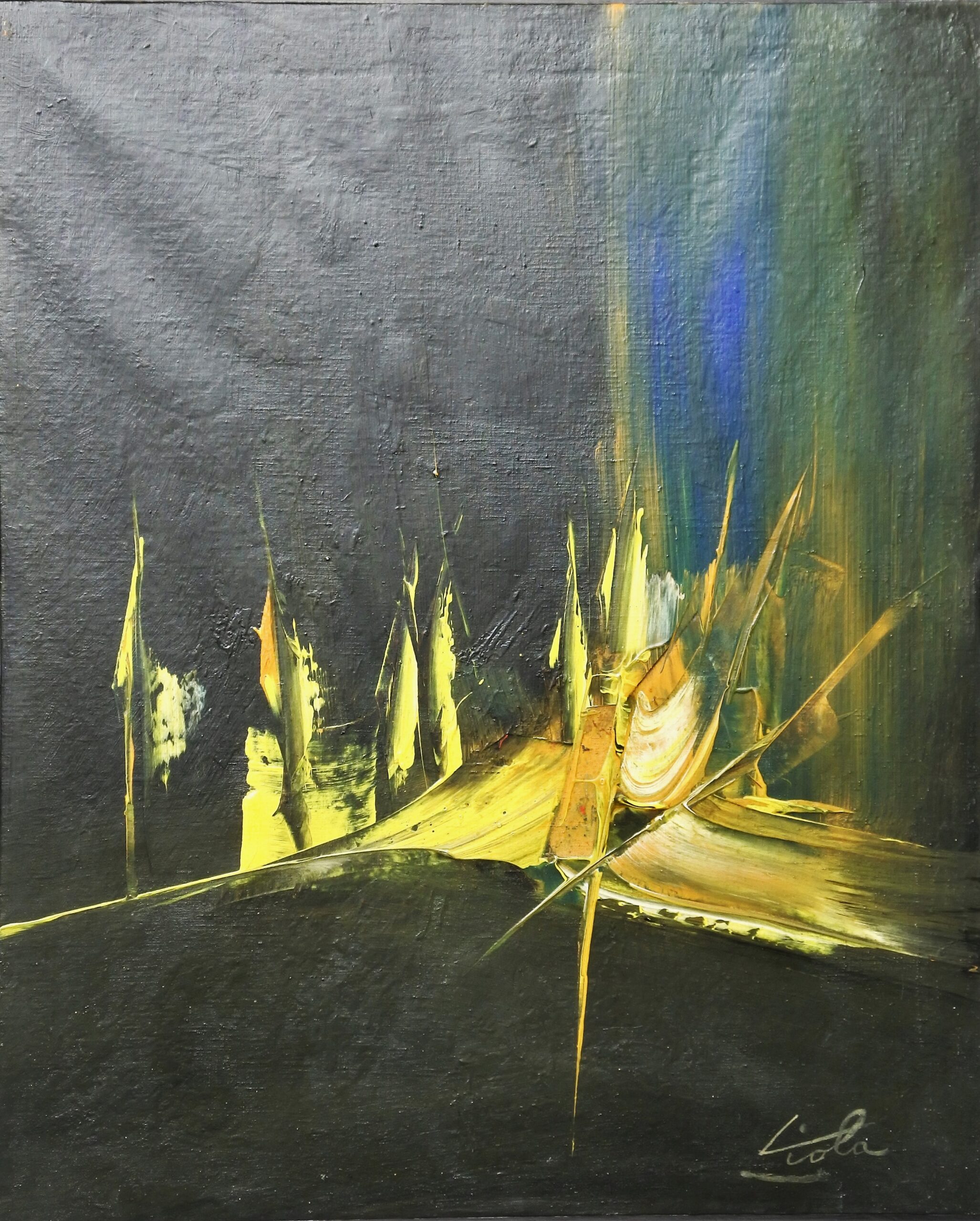 Manuel Viola 1967, Efluvios de lava, pintura técnica mixta sobre lienzo, enmarcado, pintura 61×50 cms. y marco 73×62 cms. Certificado