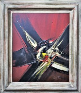 Manuel Viola 1968, Rojo dominante, pintura técnica mixta sobre tablex, enmarcado, pintura 46×38 cms. y marco 62×54 cms. Con certificado