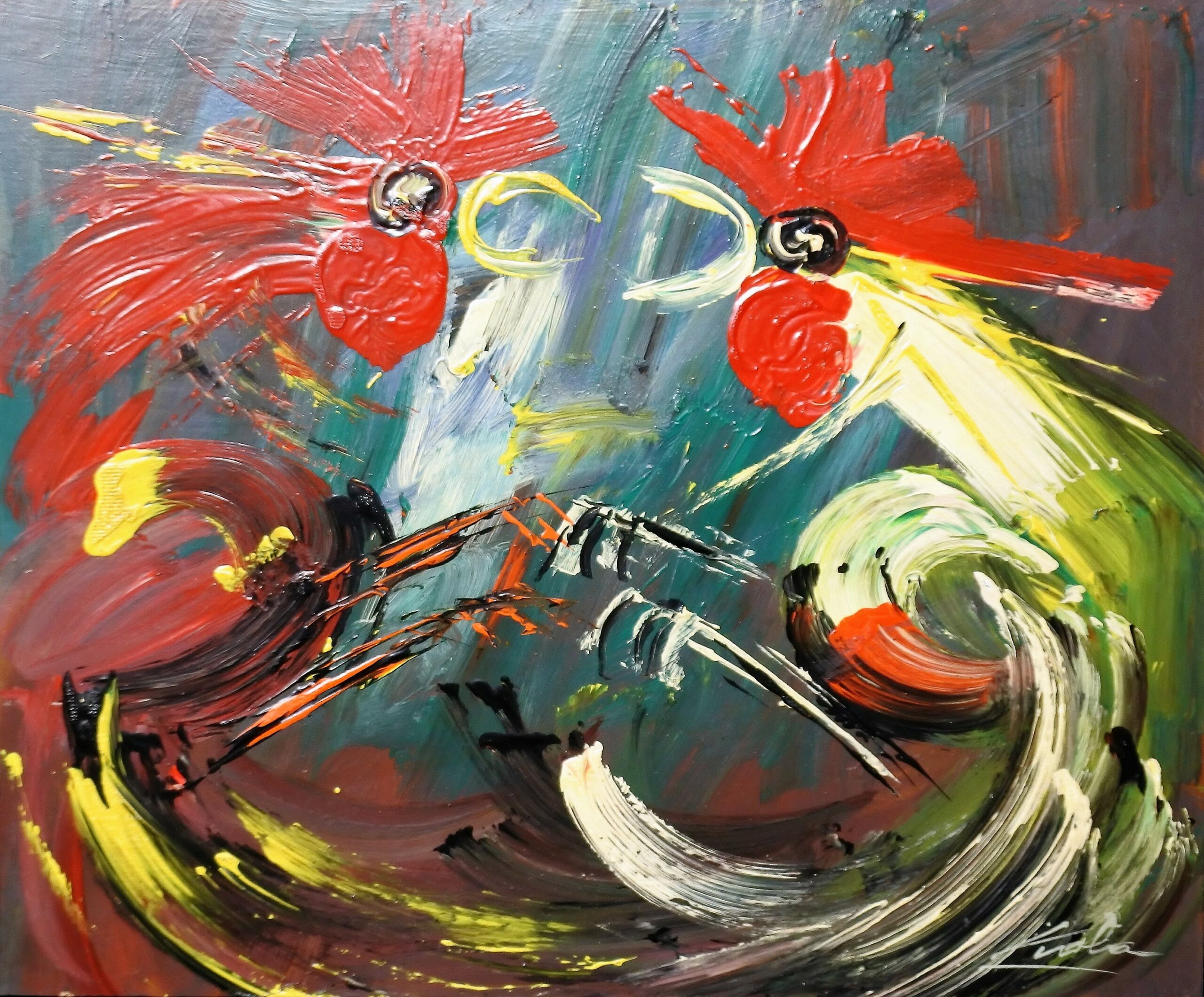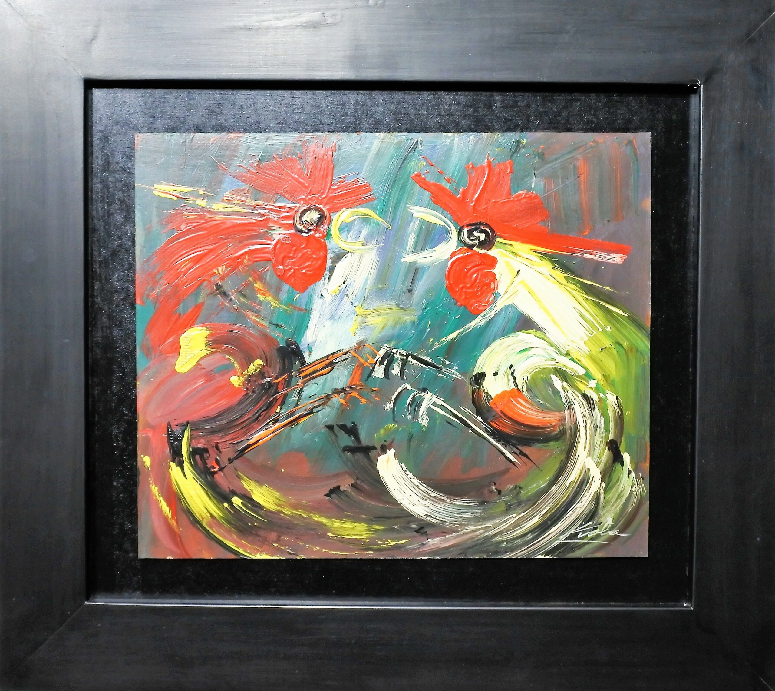 Manuel Viola 1975, Pelea de gallos, pintura técnica mixta tabla, enmarcado, pintura 38×46 y marco 63×71 cms. Catalogado