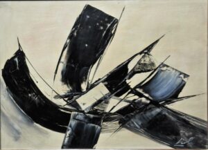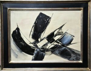 Manuel Viola, Velero negro, pintura técnica mixta tablex, enmarcado, pintura 39×52 cms. y marco 51×65 cms. Certificado