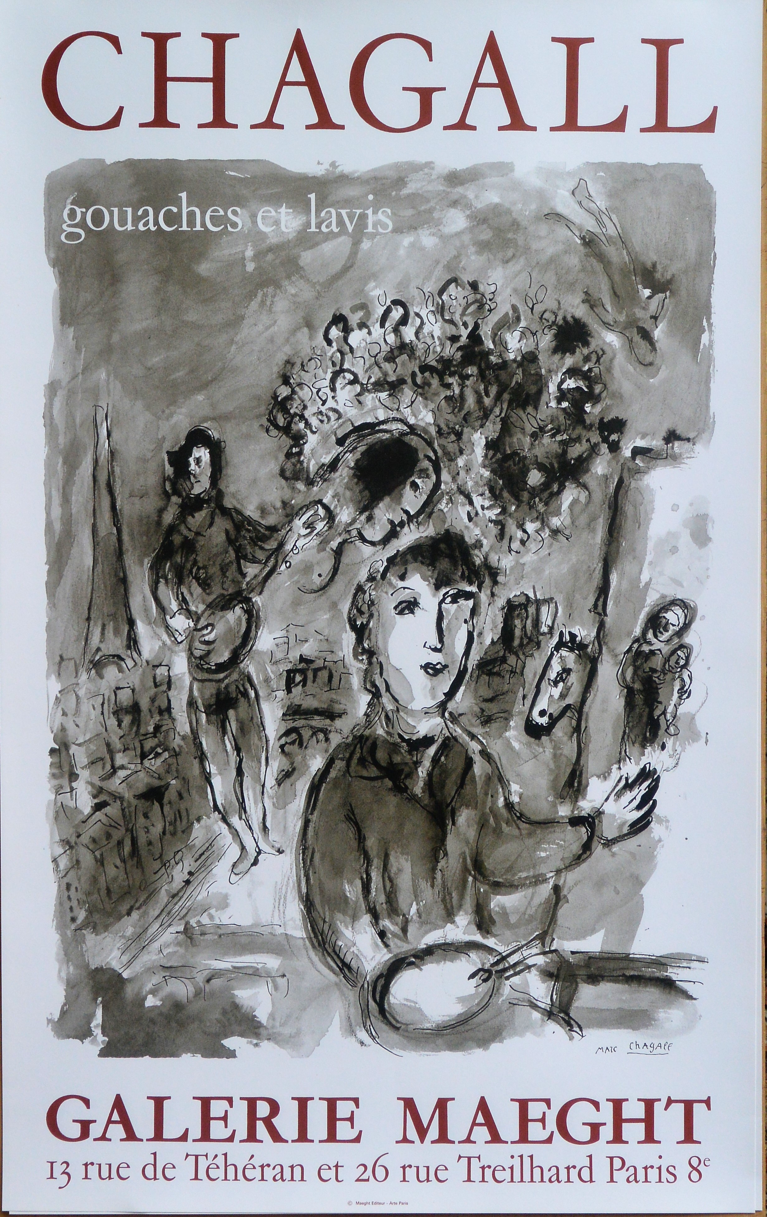Marc Chagall, Gouaches et Lavis, cartel original exposición en Galerie Maeght en 1977, 80×50 cms.
