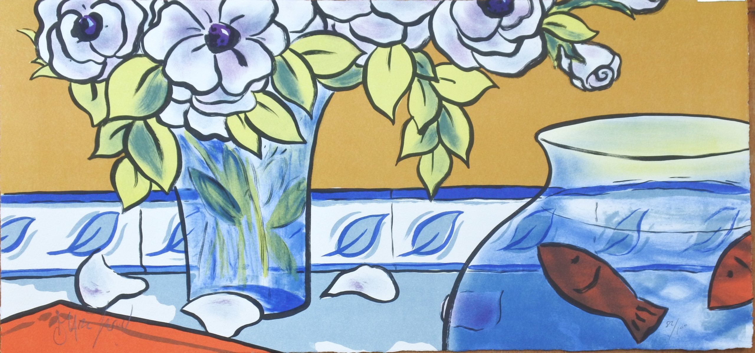 Marc Jesús, Pecera y bouquet de flores, litografía, edición 100 ejemplares, numerado y firmado a lápiz, 28×59 cms.