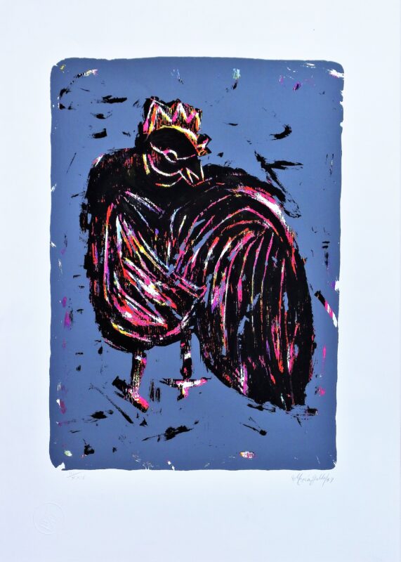 María Gallo, El gallo presumido, serigrafia, numerado III-XXV y firmado a lápiz, carpeta 25 aniversario taller Portocarrero de La Habana, 70×51 cms.