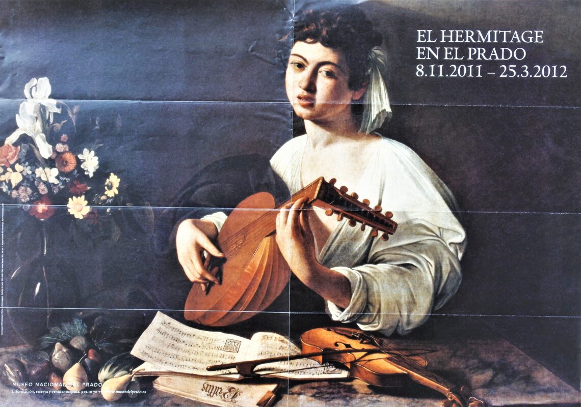 Michelangelo Caravaggio, El tocador de laud, cartel promoción exposición El Hermitage en el Prado, 48×67 cms.