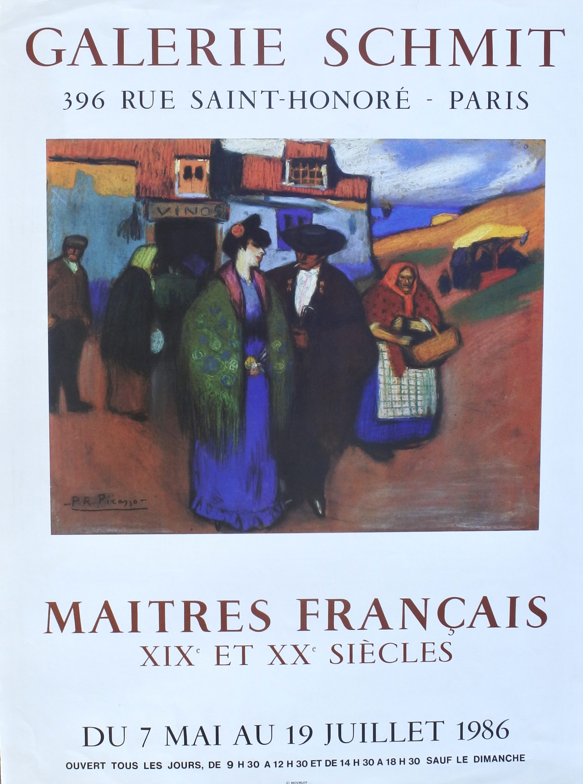 Pablo Picasso – «Couple espagnol devant une auberge» cartel litográfico original exposición en Galerie Schmit Paris en 1986, Impreso Mourlot