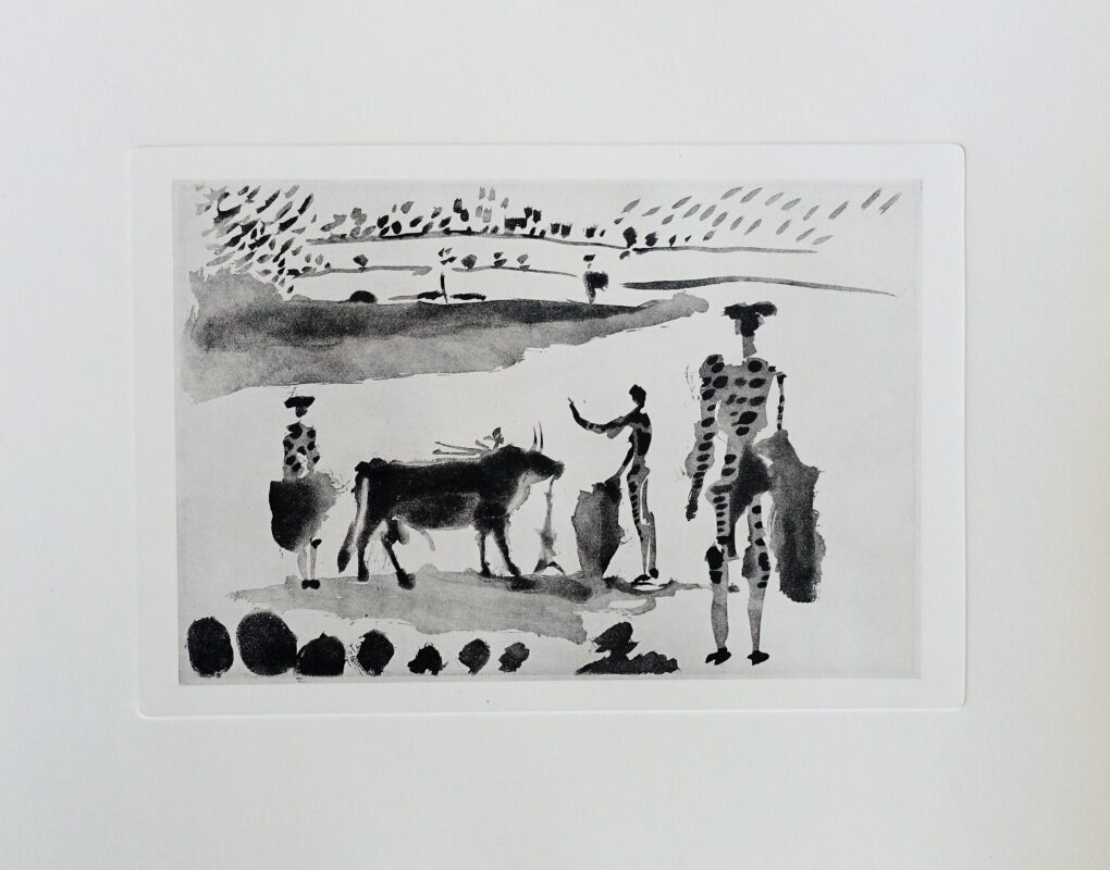 Pablo Picasso, La tauromaquia, después de la estocada el torero señala la muerte del toro, edición facsimil limitada a 1.500 ejemplares reproducida en fototipia por la editorial Gustavo Gili, plancha 29×20 cms. y papel 31×39 cms.