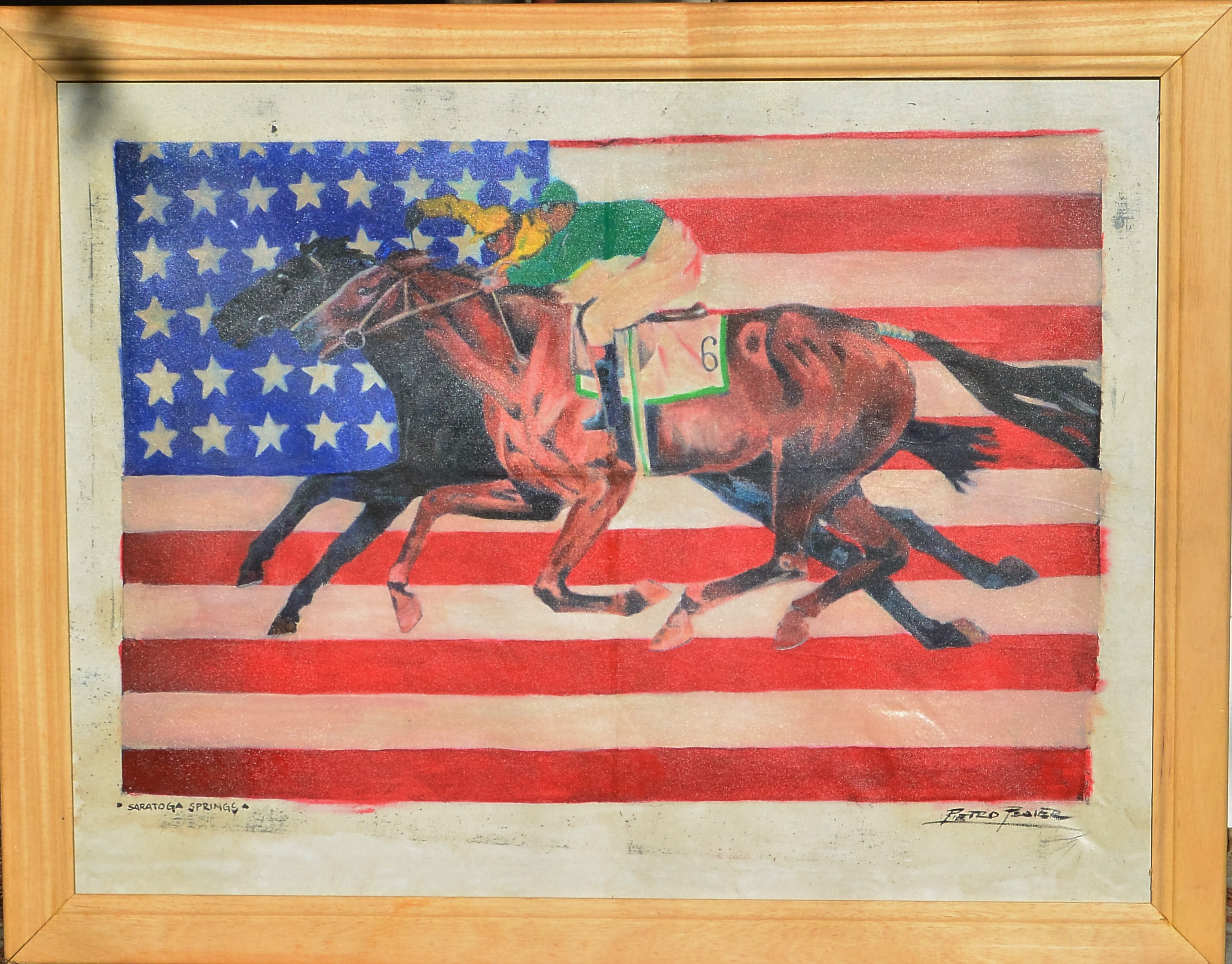 Pietro Psaier – «Flag at the race tracks, Saratoga Springs» Serigrafía y acuarela lienzo, proof, firmado, enmarcado