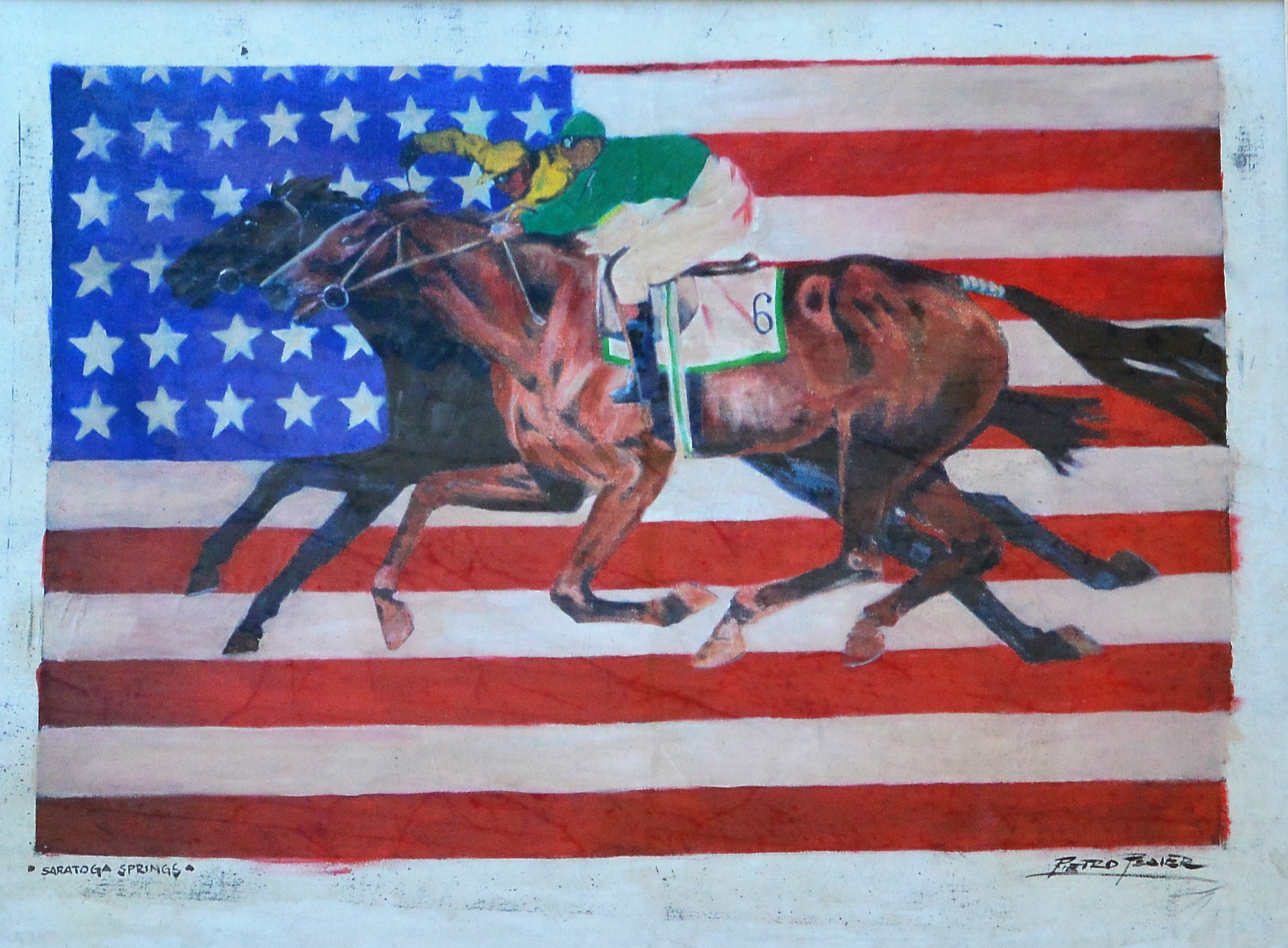Pietro Psaier, Flag at the race tracks, Saratoga Springs, Serigrafía y acuarela lienzo, proof, firmado, enmarcado, obra 66,50×88 cms. y marco 78×99,50 cms.