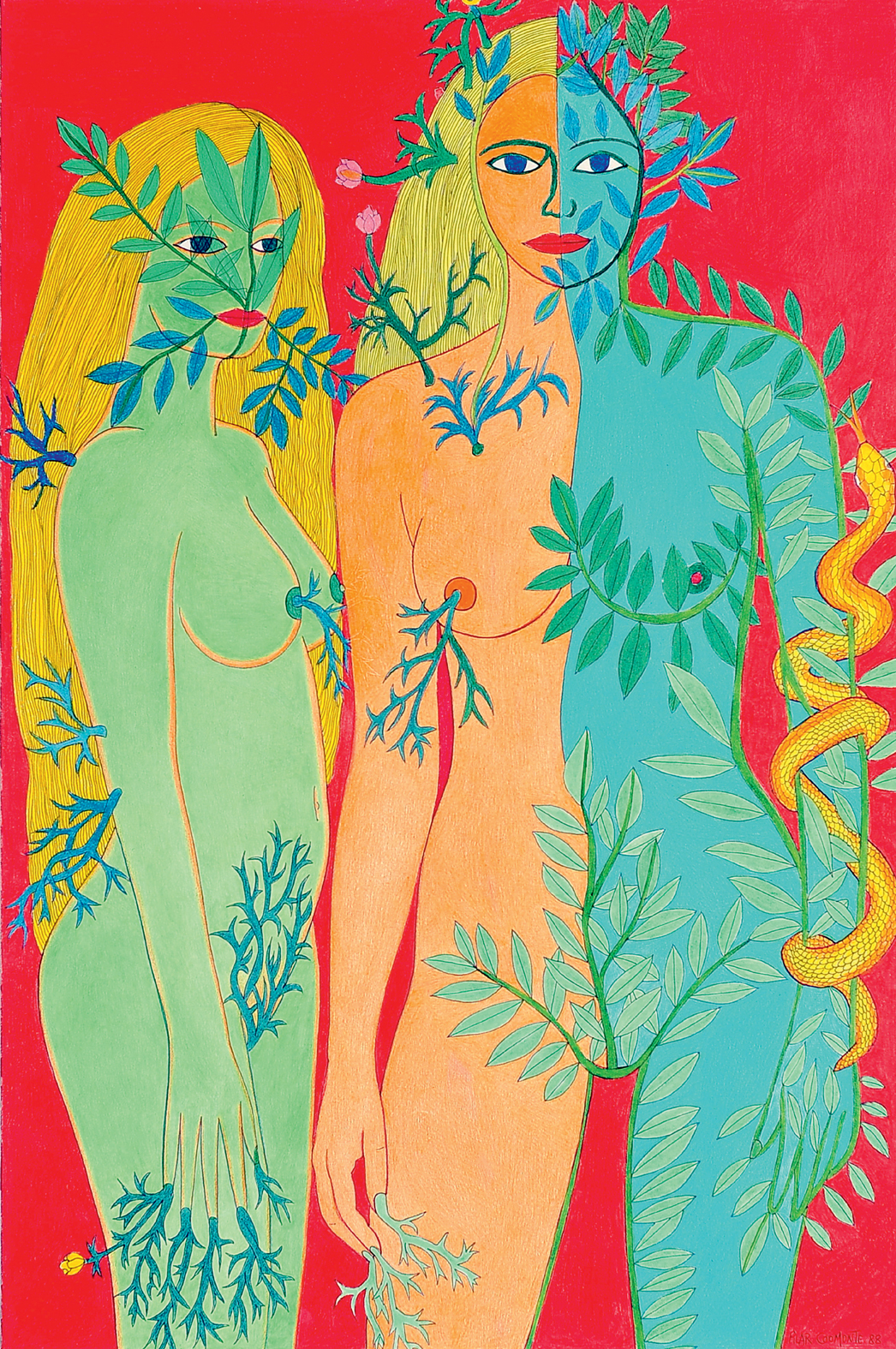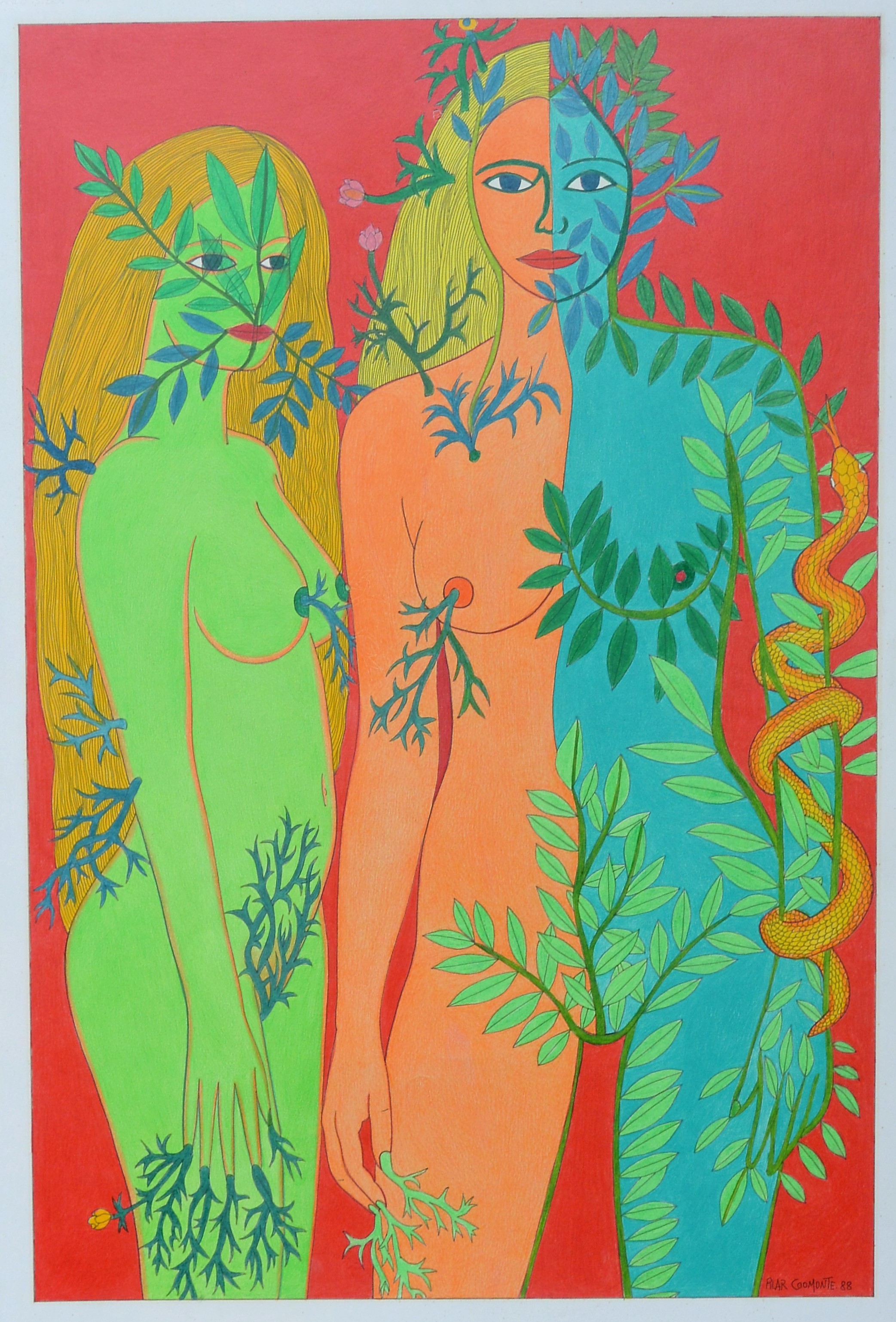 Coomonte Pilar 1988, Mujeres en el bosque, dibujo original, técnica mixta, 62×42,50 cms.