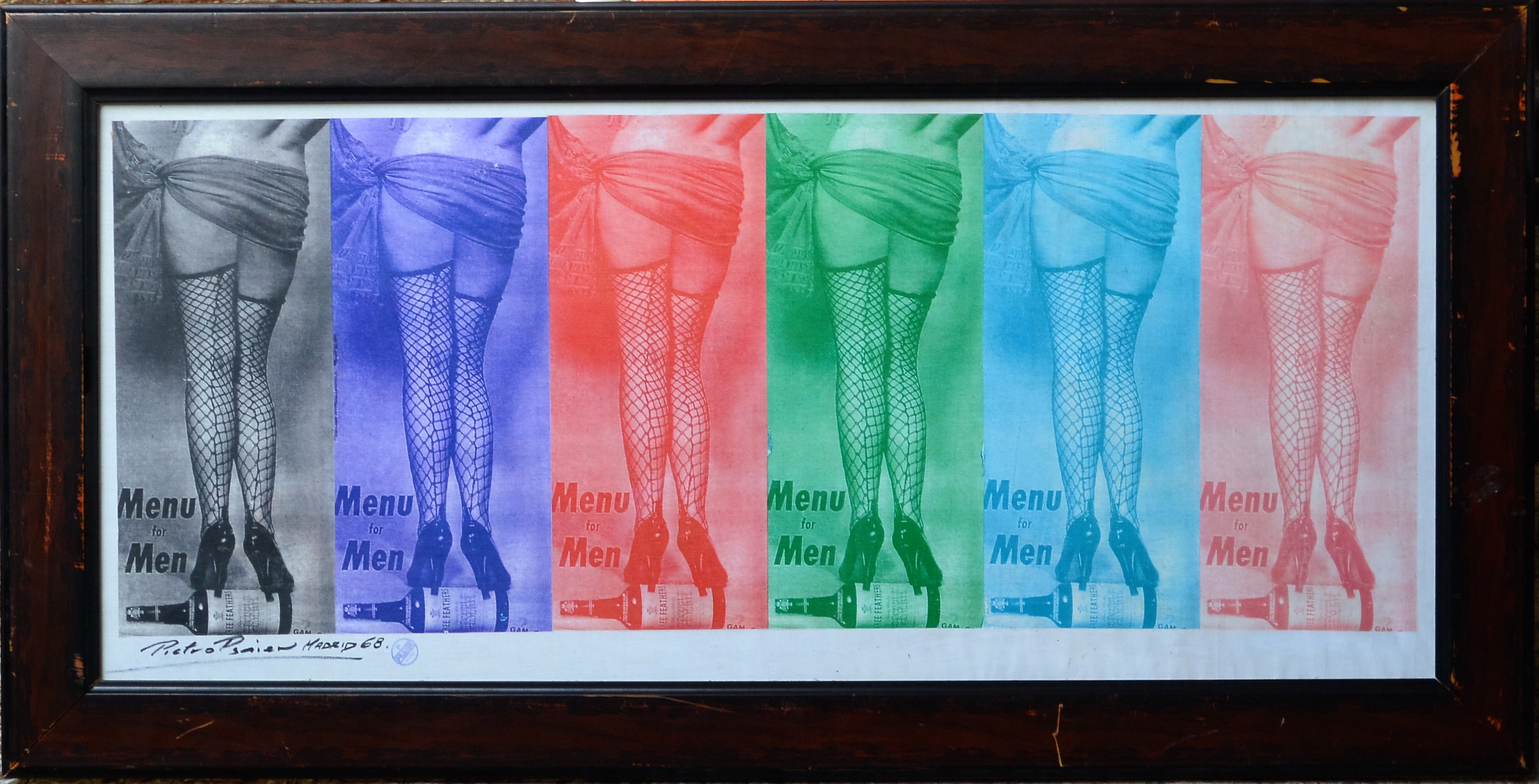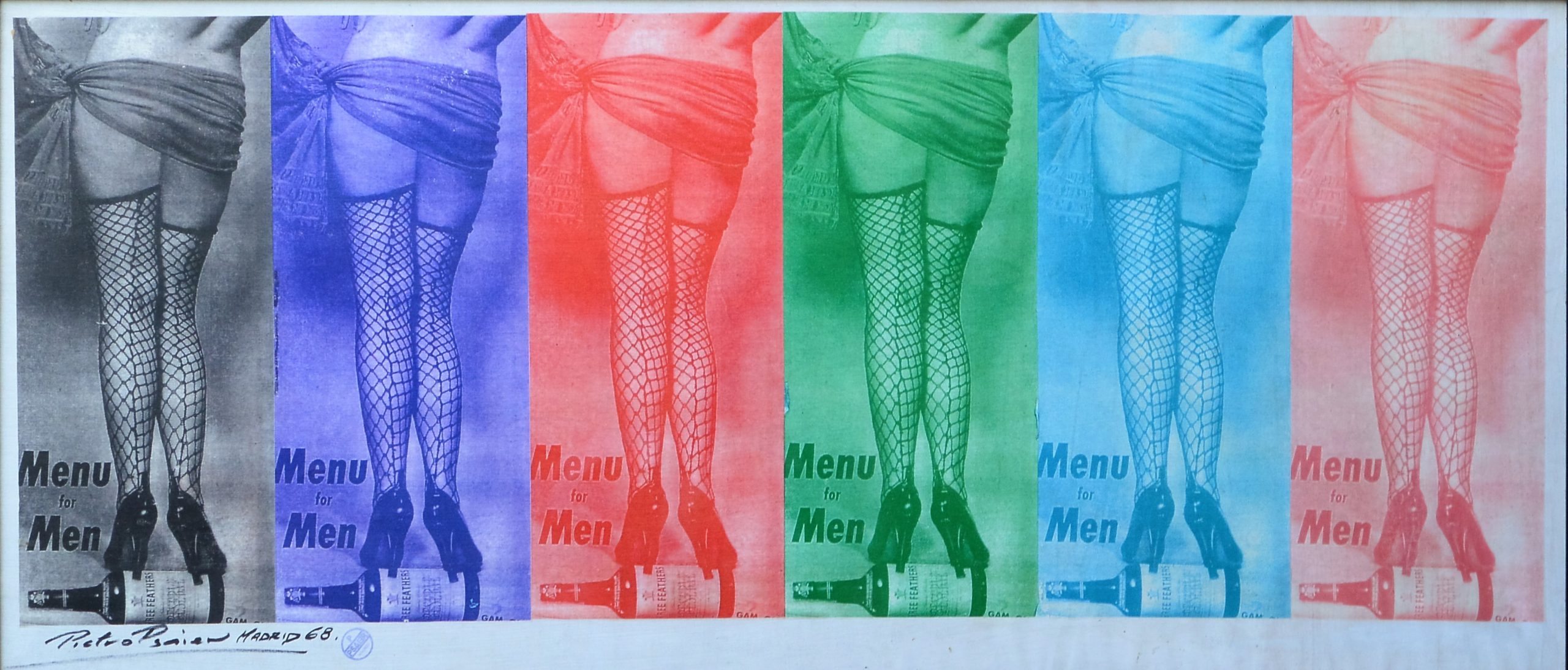 Pietro Psaier, Menu for men, serigrafía sobre lienzo, firmado Pietro Psaier Madrid 68, enmarcado, obra 47×107 cms. y marco 62x121cms.
