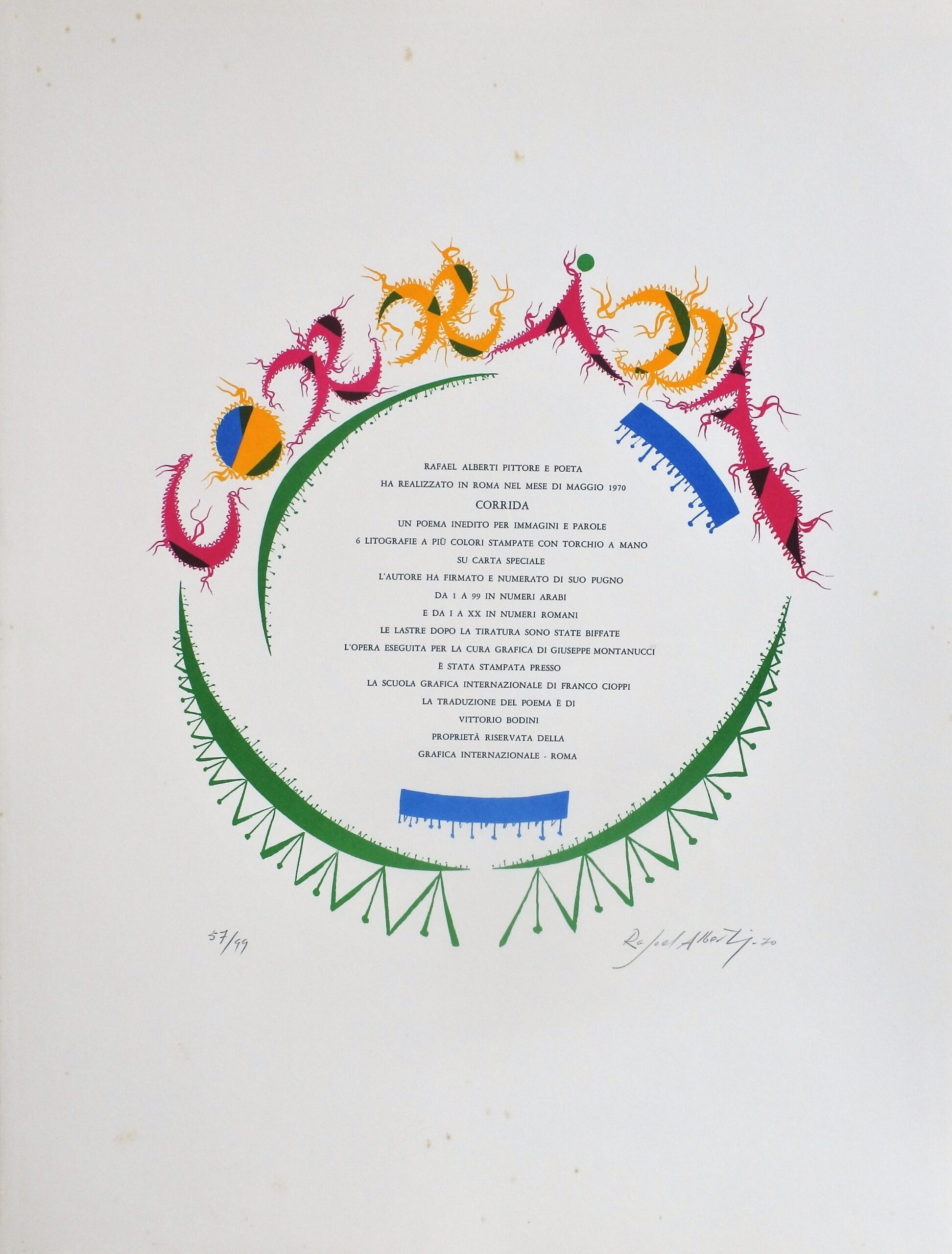 Rafael Alberti, Corrida, litografía, edición 99 ejemplares, justificación de la edición, no se incluye con la compra de la litografia, numerado y firmado a lápiz, 65×50 cms.