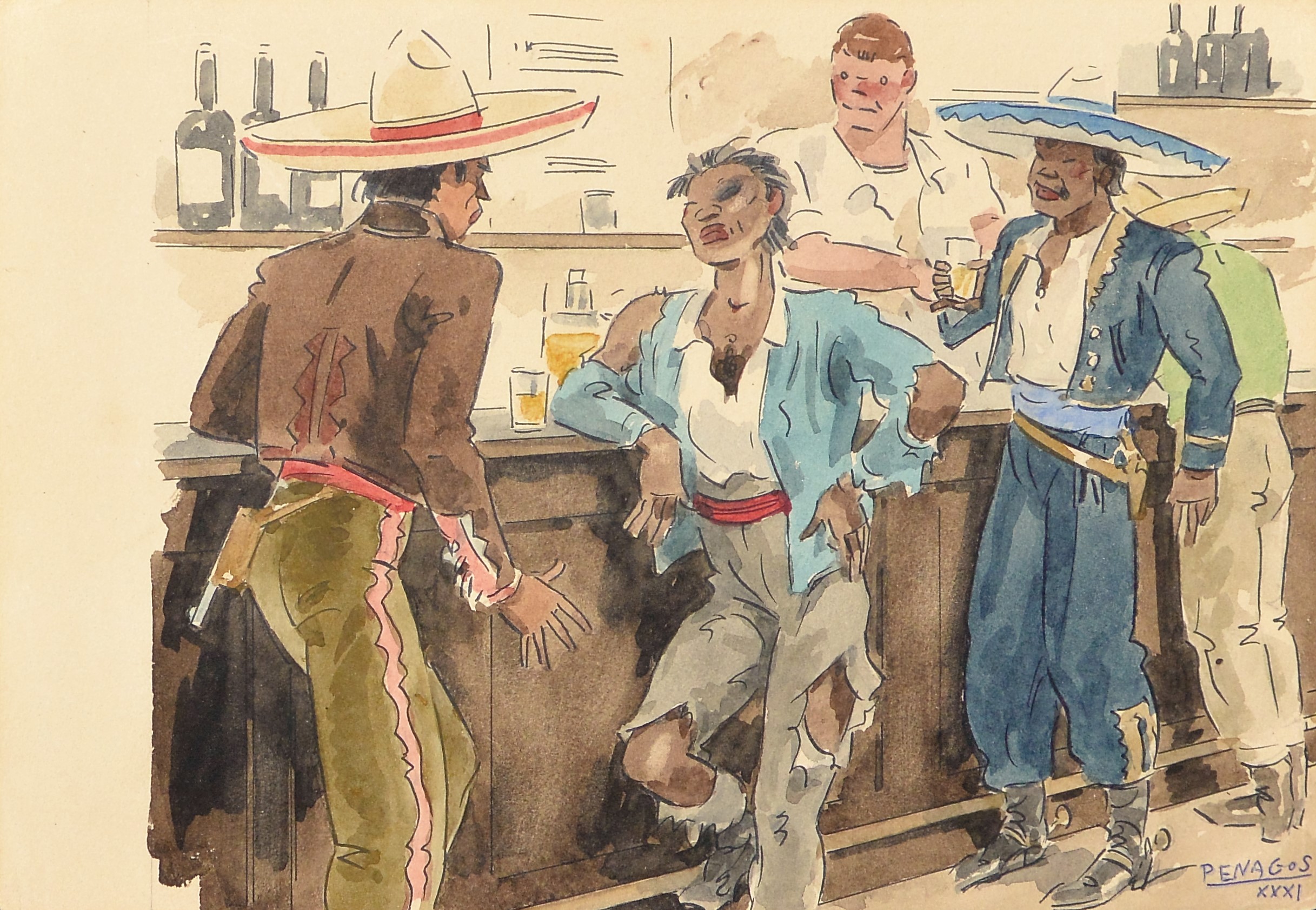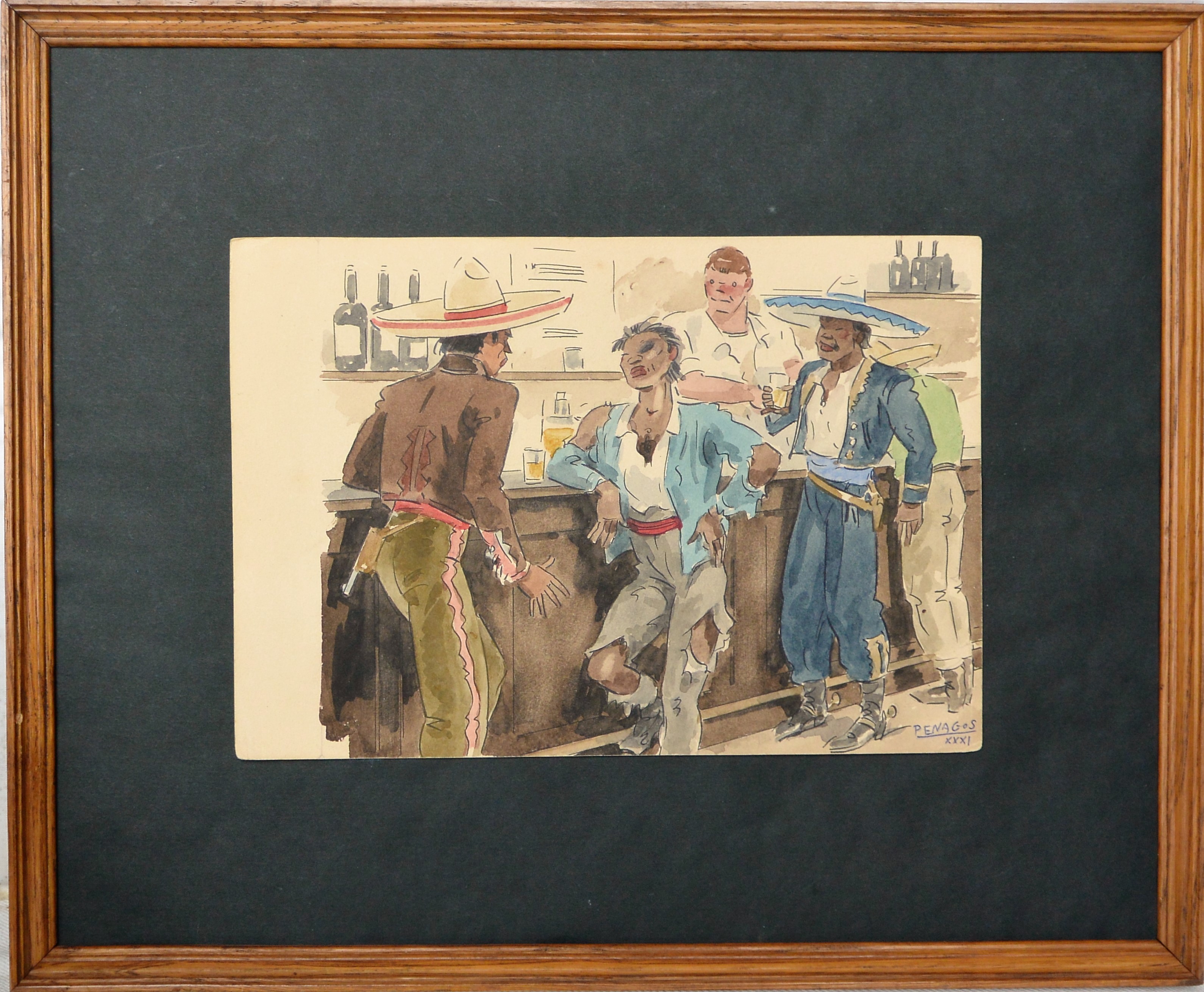 Rafael de Penagos, Taberna mexicana, 1931, dibujo tinta y acuarela papel, enmarcado, dibujo 18×26 cms. y marco 34×41,50 cms.