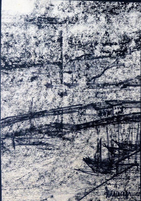 Rafael Durancamps, Vistas del puerto, dibujo tinta y carboncillo papel, enmarcado, dibujo 25×17 cms. y marco 38×29 cms.
