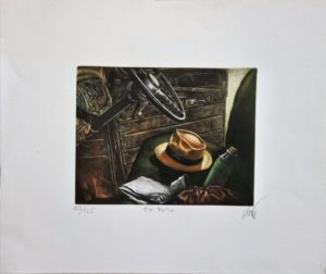 Ramiro Undabeytia, En ruta, grabado mezzotinta, edición 125 ejemplares, numerado y firmado a lápiz, plancha 19×25 y papel 37,50×45 cms.